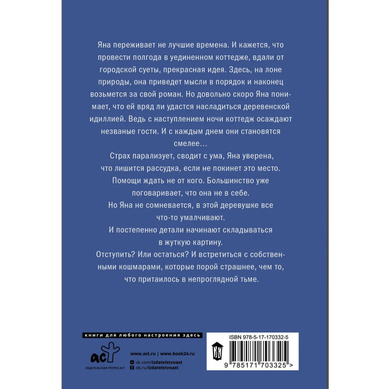 Яна переживает не лучшие времена. И поначалу ей кажется, что провести полгода в уединенном коттедже, вдали от городской суеты, прекрасная идея. Здесь, на лоне природы, она приведет мысли в порядок и наконец возьмется за свой роман. Но довольно скоро Яна понимает, что ей вряд ли удастся насладиться деревенской идиллией. Ведь с наступлением ночи коттедж осаждают незваные гости. И с каждым днем они становятся смелее Страх парализует, сводит с ума, Яна уверена, что лишится рассудка, если не покинет этом место. Помощи ждать не от кого. Большинство уже поговаривает, что она не в себе. Но Яна не сомневается, что в этой деревушке все что-то умалчивают. И постепенно детали начинают складываться в жуткую картину. Отступить? Или остаться? И встретиться с собственными кошмарами, которые порой страшнее, чем то, что притаилось в непроглядной тьме.