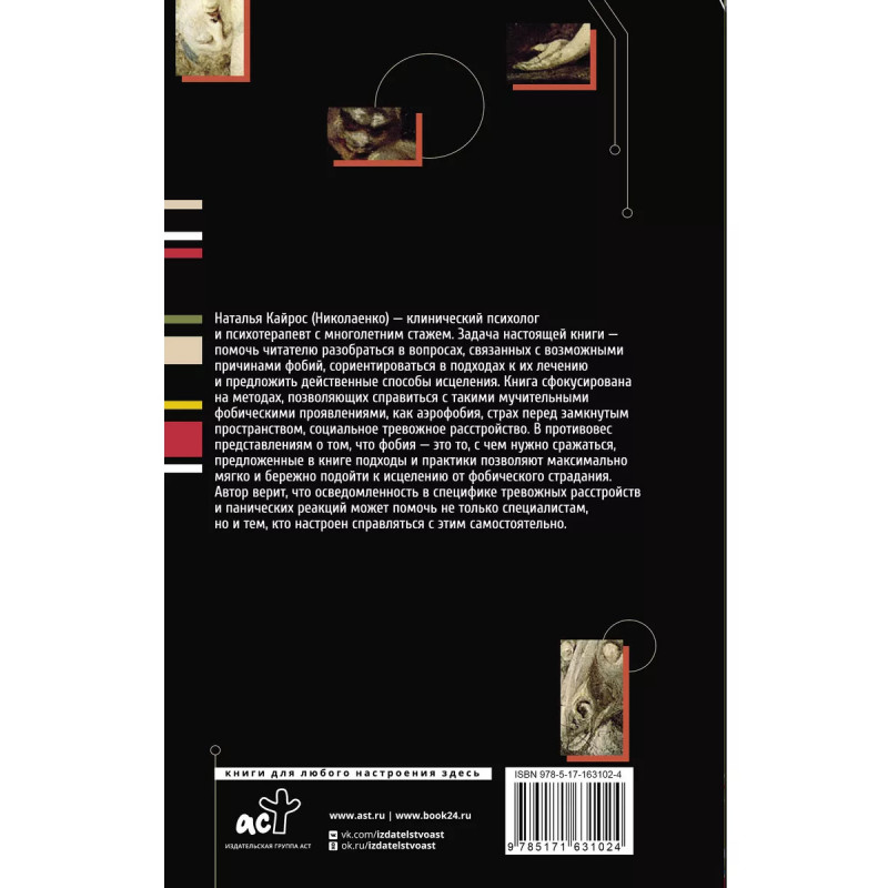Наталья Николаенко (Кайрос) клинический психолог и психотерапевт с многолетним стажем. Задача настоящей книги помочь читателю разобраться в вопросах, связанных с возможными причинами фобий, сориентироваться в подходах к их лечению и предложить действенные способы исцеления. Книга сфокусирована на методах, позволяющих справиться с такими мучительными фобическими проявлениями, как аэрофобия, страхи перед замкнутым пространством, социальное тревожное расстройство. В противовес представлениям о том, что фобия это то, с чем нужно сражаться, предложенные в книге подходы и практики позволяют максимально мягко и бережно подойти к исцелению от фобического страдания. Автор верит, что осведомленность в специфике тревожных расстройств и панических реакций может помочь не только специалистам, но и тем, кто настроен справляться с этим самостоятельно.