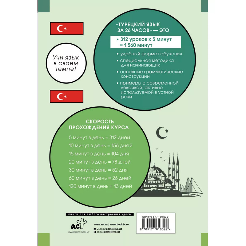 София Леонидовна Куталмыш преподаватель турецкого языка с 2010 года, переводчик художественной литературы. Училась в Сибирском институте международных отношений и регионоведения (СИМОР, Новосибирск) и в университете Фатих (Стамбул). Получила степень кандидата филологических наук в Санкт-Петербургском государственном университете (СПбГУ, Санкт-Петербург). "Турецкий язык за 26 часов" это практический самоучитель, который поможет вам быстро и без усилий овладеть необходимыми грамматическими конструкциями и заговорить на турецком. В каждом уроке дается одно базовое выражение. После прохождения 312 уроков по 5 минут вы сможете легко поддержать беседу на простые темы. Пособие написано под общей редакцией М. Куталмыш, доктора филологических наук, профессора Университета Болу Абант Иззет Байсал (Турция). Книга адресована всем, кто хочет овладеть основами турецкого языка, и подойдет как обучающимся с нуля, так и тем, кто уже изучает язык самостоятельно или на курсах.
