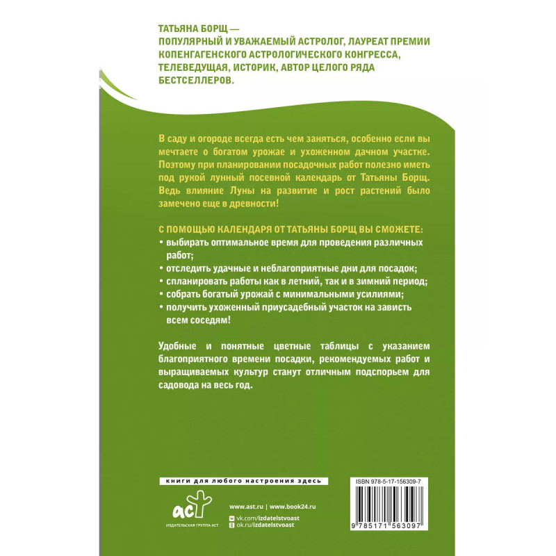 Татьяна Борщ популярный и уважаемый астролог, лауреат премии Копенгагенского астрологического конгресса, телеведущая, историк, автор целого ряда бестселлеров. В саду и огороде всегда есть чем заняться, особенно если вы мечтаете о богатом урожае и ухоженном дачном участке. Поэтому при планировании посадочных работ полезно иметь под рукой лунный посевной календарь от Татьяны Борщ. Ведь влияние Луны на развитие и рост растений было замечено еще в древности! С помощью календаря от Татьяны Борщ вы сможете: выбрать оптимальное время для проведения различных работ; отследить удачные и неблагоприятные дни для посадок; спланировать работы как в летний, так и в зимний период; собрать богатый урожай с минимальными усилиями; получить ухоженный приусадебный участок на зависть всем соседям! Удобные и понятные цветные таблицы с указанием благоприятного времени посадки, рекомендуемых работ и выращиваемых культур станут отличным подспорьем для садовода на весь год.