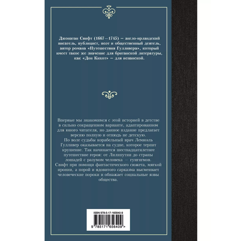 Впервые мы знакомимся с этой историей в детстве в сильно сокращенном варианте, адаптированном для юного читателя, но данное издание предлагает версию полную и отнюдь не детскую. По воле судьбы корабельный врач Лемюэль Гулливер оказывается на судне, которое терпит крушение. Так начинается шестнадцатилетнее путешествие героя: от Лилипутии до страны лошадей с разумом человека гуигнгмов. Свифт при помощи фантастического сюжета, мягкой иронии, а порой и ядовитого сарказма высмеивает человеческие пороки и обнажает социальные язвы общества.