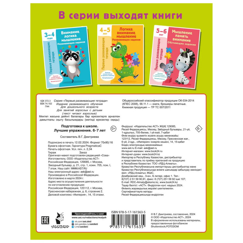 Волнуетесь, готов ли ребёнок к школе? Достаточно ли у него знаний? Предлагаем вашему вниманию «Подготовка к школе. Лучшие упражнения. 6-7 лет» — полезный тренажёр из серии «Первые развивающие тетради». Ребёнок узнает много нового об окружающем мире, поиграет в занимательные игры, выполнит задания, развивающие интеллект, подготовит руку к письму. Наша книга поможет маленьким умникам и умницам развить аналитическое мышление и оперативную память, автоматизировать навыки в математике и грамматике, научиться решать логические задачки, быть внимательными и сосредоточенными. Все эти умения и навыки — необходимое условие для успешного обучения в школе.