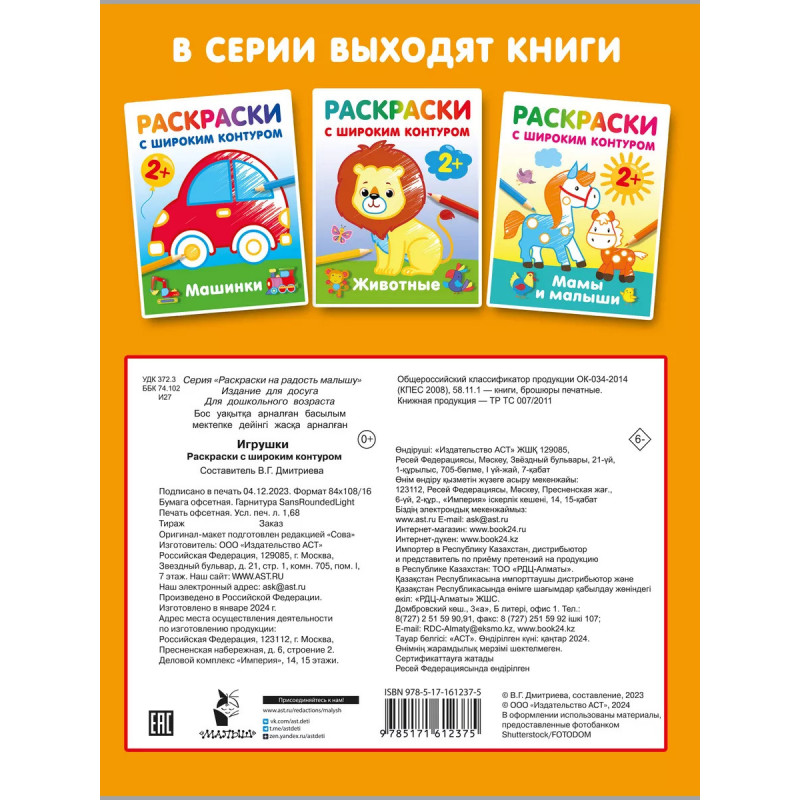 Игрушки. Раскраски с широким контуром. В книгах новой развивающей серии - забавные картинки с широким цветным контуром + развивающие задания + весёлые стихи об игрушках. Ребят ждёт знакомство с компанией цветных карандашей, которые подскажут, в какие цвета раскрасить каждый рисунок. Раскрашивать картинки с цветным широким контуром интересно и очень полезно - такие занятия расширяют кругозор и словарный запас, формируют графические навыки, развивают мышление, память, внимание, наблюдательность и творческие способности. Помогите ребенку раскрасить мячик, куклу или юлу цветными карандашами, маркерами и мелками, красками - подарите малышу счастливые минуты совместного творчества. Малыш постарается всё сделать аккуратно - и у него обязательно получатся замечательные картинки!