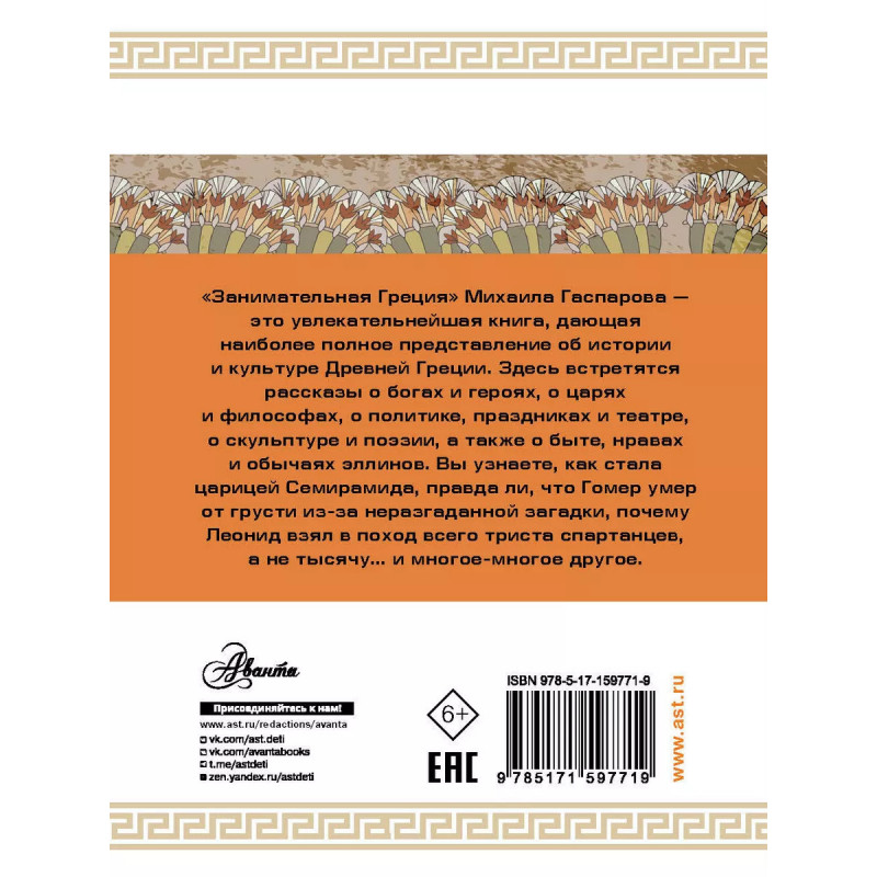 Занимательная Греция. Михаил Леонович Гаспаров (1935 - 25) - литературовед, переводчик, лауреат множества государственных премий, автор книг, по праву считающихся классикой научно-популярного жанра. Книга "Занимательная Греция" просто и увлекательно рассказывает о древнегреческой культуре и очень любима как взрослыми читателями, так и детьми. Она разделена на шесть частей, в которых вам встретятся рассказы о богах и героях, о царях и философах, о политике, праздниках и театре, о скульптуре и поэзии, а также о быте, нравах и обычаях эллинов. Вы узнаете, как стала царицей Семирамида, правда ли, что Гомер умер от грусти из-за неразгаданной загадки, почему Леонид взял в поход всего триста спартанцев, а не тысячу... и многое-многое другое. Для среднего школьного возраста.