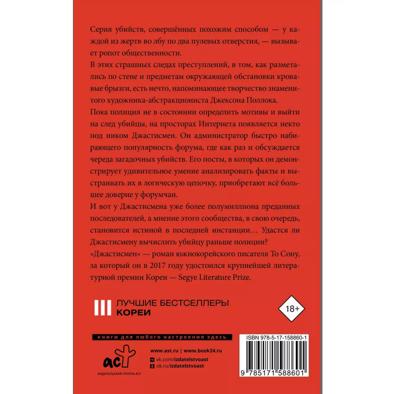Серия убийств, совершённых похожим способом у каждой из жертв во лбу по два пулевых отверстия, вызывает ропот общественности. В этих страшных следах преступлений, в том, как разметались по стене и предметам окружающей обстановки кровавые брызги, есть нечто, напоминающее творчество знаменитого художника-абстракциониста Джексона Поллока. Пока полиция не в состоянии определить мотивы и выйти на след убийцы, на просторах Интернета появляется некто под ником Джастисмен. Он администратор быстро набирающего популярность форума, где как раз и обсуждается череда загадочных убийств. Его посты, в которых он демонстрирует удивительное умение анализировать факты и выстраивать их в логическую цепочку, приобретают всё большее доверие у форумчан. И вот у Джастисмена уже более полумиллиона преданных последователей, а мнение этого сообщества, в свою очередь, становится истиной в последней инстанции Удастся ли Джастисмену вычислить убийцу раньше полиции?