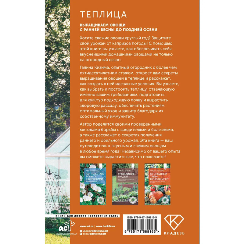 Хотите свежие овощи круглый год? Защитите свой урожай от капризов погоды! С помощью этой книги вы узнаете, как обеспечивать себя вкуснейшими домашними овощами не только на огородный сезон. Галина Кизима, опытный огородник с более чем пятидесятилетним стажем, откроет вам секреты выращивания овощей в теплице и расскажет, как создать в ней идеальные условия. Вы узнаете, как выбрать и построить теплицу, отвечающую именно вашим требованиям, подготовить для культур подходящую почву и вырастить здоровую рассаду, обеспечить растениям оптимальный уход и защиту благодаря их собственному иммунитету. Автор поделится своими проверенными методами борьбы с вредителями и болезнями, а также расскажет о секретах получения раннего и обильного урожая. Эта книга — ваш путеводитель к вкусным и свежим овощам в любое время года! Независимо от вашего опыта, вы сможете вырастить все, что пожелаете!