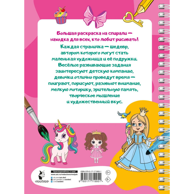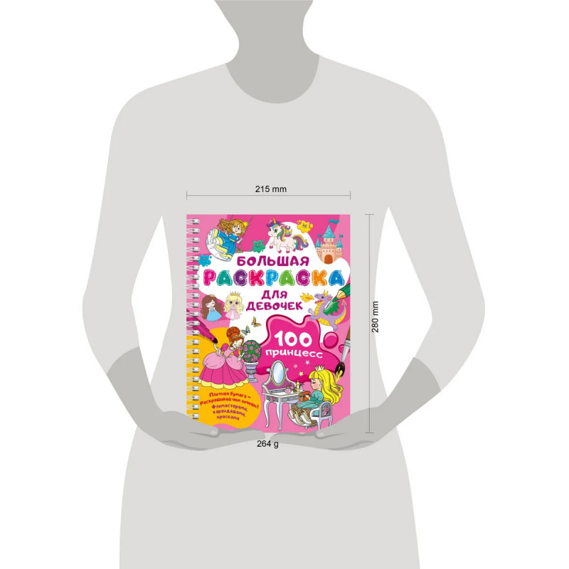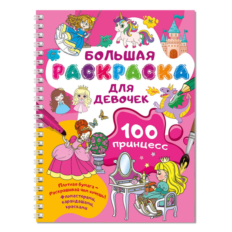 "100 принцесс. Большая раскраска для девочек" — шедевр, автором которого могут стать маленькая художница и её подружки. Книга на спирали идеальна для рисования и раскрашивания. Заниматься очень удобно — благодаря спирали страницы раскраски легко перекидываются из стороны в сторону, открываясь на 360 градусов. Эта книга должна быть у каждой девочки — целая коллекция чудесных иллюстраций. Читая короткие тексты развивающих заданий и раскрашивая картинки, подружки смогут развить художественный вкус, внимание, мелкую моторику, научится аккуратности, расширят словарный запас.