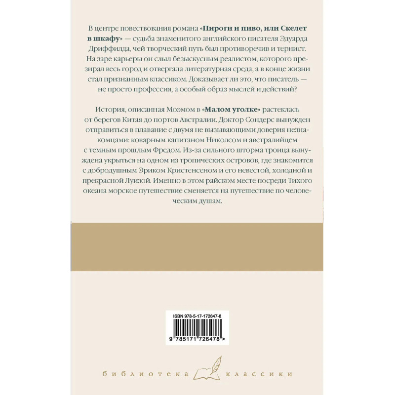 В центре повествования романа «Пироги и пиво, или Скелет в шкафу» — судьба знаменитого английского писателя Эдуарда Дриффилда, чей творческий путь был противоречив и тернист. На заре карьеры он слыл безыскусным реалистом, которого презирал весь город и отвергала литературная среда, а в конце жизни стал признанным классиком. Доказывает ли это, что писатель — не просто профессия, а особый образ мыслей и действий? История, описанная в романе «Малый уголок», растеклась от берегов Китая до портов Австралии. Доктор Сондерс вынужден отправиться в плавание с двумя не вызывающими доверия незнакомцами: коварным капитаном Николсом и австралийцем с темным прошлым Фредом. Из-за сильного шторма троица вынуждена укрыться на одном из тропических островов, где знакомится с добродушным Эриком Кристенсеном и его невестой, холодной и прекрасной Луизой. Именно в этом райском месте посреди Тихого океана морское путешествие сменяется на путешествие по человеческим душам.