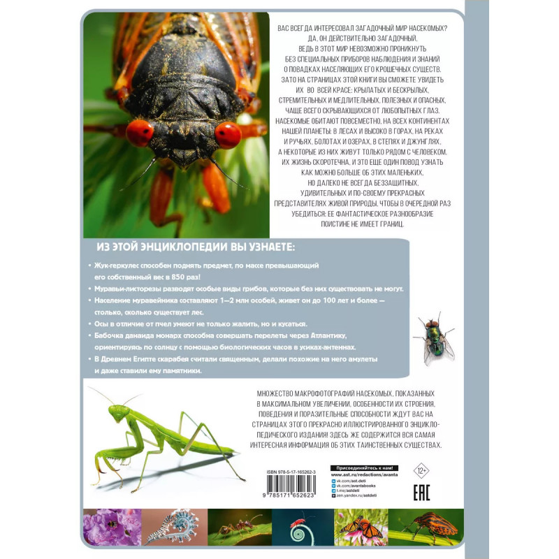 Эта большая энциклопедия откроет юным читателям удивительный и необычайно разнообразный мир насекомых крошечных животных, населяющих практически все уголки земного шара. Из-за их небольших размеров и скрытного образа жизни мы мало знаем о том, как они появляются на свет, развиваются, добывают себе пропитание, дают потомство и в каких местах чаще всего обитают. А ведь насекомых на нашей планете просто невероятное множество более трех миллионов видов! Некоторые из них живут рядом с человеком и приносят ему неоценимую пользу, как, например, медоносные пчелы или тутовый шелкопряд, другие являются злостными вредителями кто же не слышал, к примеру, о колорадском жуке или рыжем таракане? В этой книге рассказывается о быстрых стрекозах, "музыкальных" сверчках и кузнечиках, вездесущих тараканах ипрожорливой саранче, о самых разных жуках, прекрасных бабочках и "полосатых" пчелах, шмелях и осах, о тружениках муравьях и о многих других представителях загадочного микромира насекомых.