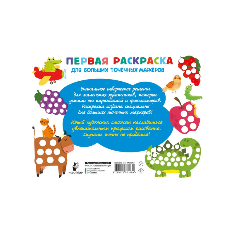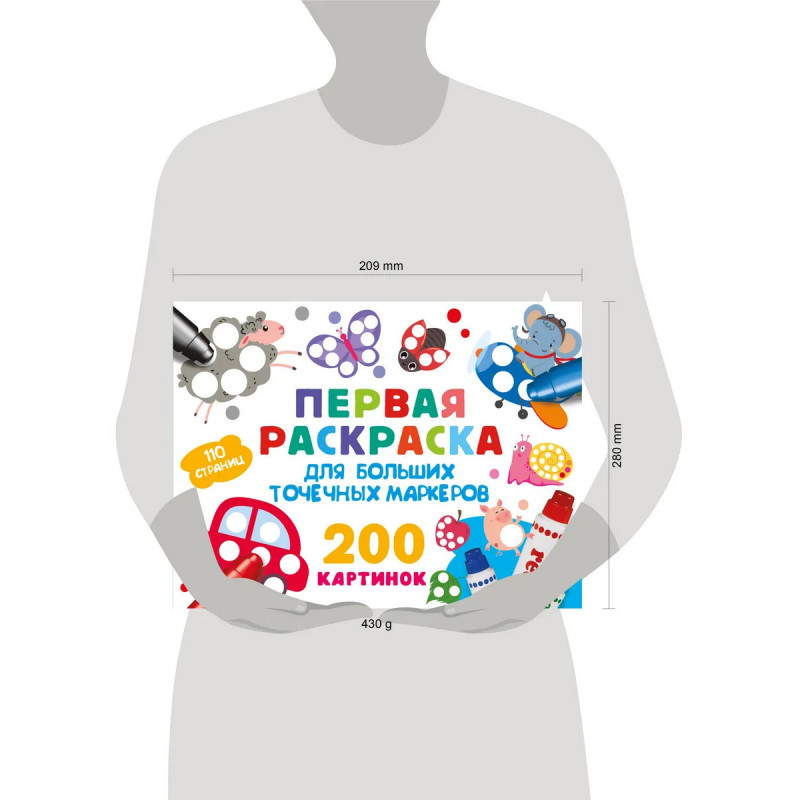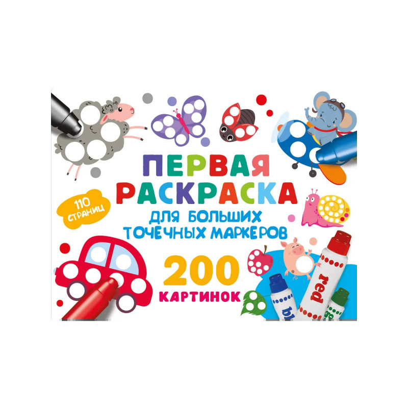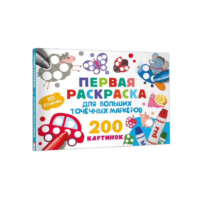 "Первая раскраска для больших точечных маркеров. 200 картинок" — уникальное творческое решение для деток, которым ещё тяжело управляться с кисточкой или карандашами и фломастерами. Раскраска создана специально для больших точечных маркеров! Малыши в игровой форме разовьют фантазию и логику, а ещё — мелкую моторику. Юные художники изучат цвета и смогут насладиться увлекательным процессом рисования. Этот набор из 200 картинок станет прекрасным подарком для дошколят, поможет увлечься новым видом хобби и творчества. Раскрашивать можно как одному, так и в кругу семьи или друзей. Скучно точно не будет. Не упустите возможность порадовать ваших детей таким потрясающим подарком!