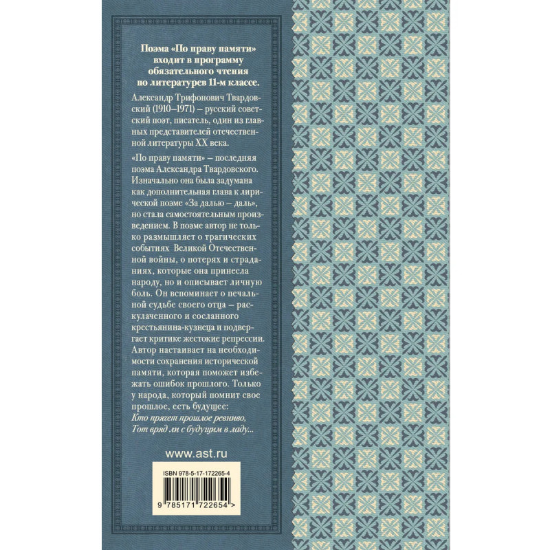 Поэма "По праву памяти" входит в программу обязательного чтения по литературе в 11-м классе. Александр Трифонович Твардовский (1910–1971) — русский советский поэт, писатель, один из главных представителей отечественной литературы XX века. "По праву памяти" — последняя поэма Александра Твардовского. Изначально она была задумана как дополнительная глава к лирической поэме "За далью – даль", но стала самостоятельным произведением. В поэме автор не только размышляет о трагических событиях Великой Отечественной войны, о потерях и страданиях, которые она принесла народу, но и описывает личную боль. Он вспоминает о печальной судьбе своего отца — раскулаченного и сосланного крестьянина-кузнеца и подвергает критике жестокие репрессии. Автор настаивает на необходимости сохранения исторической памяти, которая поможет избежать ошибок прошлого. Только у народа, который помнит свое прошлое, есть будущее: Кто прячет прошлое ревниво, Тот вряд ли с будущим в ладу…