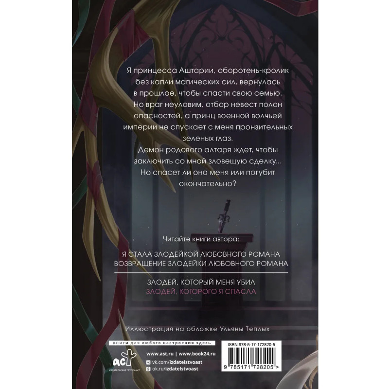 – Продолжение романа «Злодей, который меня убил». – Действие происходит во вселенной книг «Я стала злодейкой любовного романа» и «Возвращение злодейки любовного романа». – Легкая динамичная история с хорошим юмором, красивым слогом, яркими эмоциями и героями, которые влюбляют в себя читателей. – Интриги империи оборотней и жестокая конкуренция между потенциальными невестами видных аристократов. – Для поклонников вебтунов «Однажды я стала принцессой», «Невеста герцога по контракту», «Аделаида» и новеллы «Единственный конец злодейки – смерть».