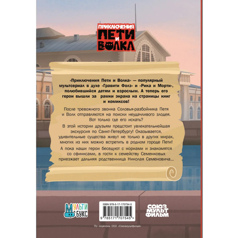 После тревожного звонка Соловья-разбойника Петя и Волк отправляются на поиски неудачливого злодея. Вот только где его искать? В этой истории друзьям предстоит увлекательнейшая экскурсия по Санкт-Петербургу! Оказывается, удивительные существа живут не только в других мирах, многих из них можно встретить в родном городе Пети! А пока наши герои беседуют с норнами и знакомятся со сфинксами, в гости к семейству Семенковых приезжает дальняя родственница Николая Семеновича…