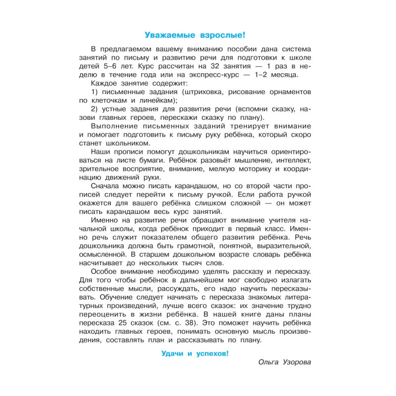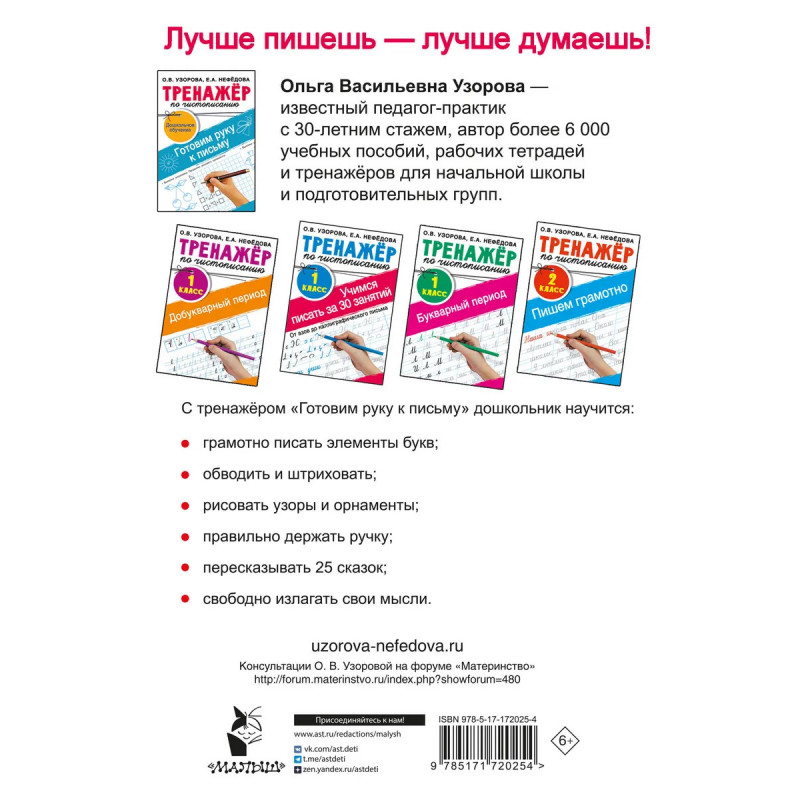 Рабочая тетрадь «Тренажёр по чистописанию. Готовим руку к письму» основана на авторской методике известного педагога-практика О. В. Узоровой. На страницах тетради — прописи, штриховки и другие интересные и полезные задания, которые помогут дошкольнику сформировать ровный разборчивый почерк, научиться ориентироваться на листе бумаги, развить речь, подготовиться к школе.