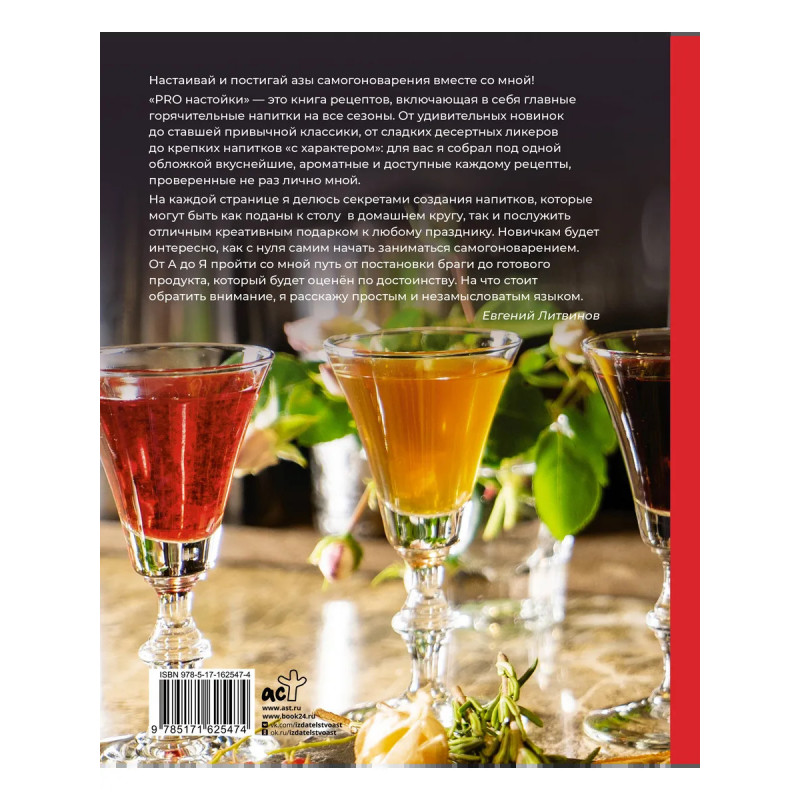 Настаивай и постигай азы самогоноварения вместе со мной! "PRO настойки" - это книга рецептов, включающая в себя главные горячительные напитки на все сезоны. От удивительных новинок до ставшей привычной классики, от сладких десертных ликеров до крепких напитков «с характером»: для вас я собрал под одной обложкой самые вкуснейшие, ароматные и доступные каждому рецепты, проверенные не раз лично мной. На каждой странице я делюсь секретами создания напитков, которые могут быть как поданы к столу в домашнем кругу, так и послужить отличным креативным подарком к любому празднику.