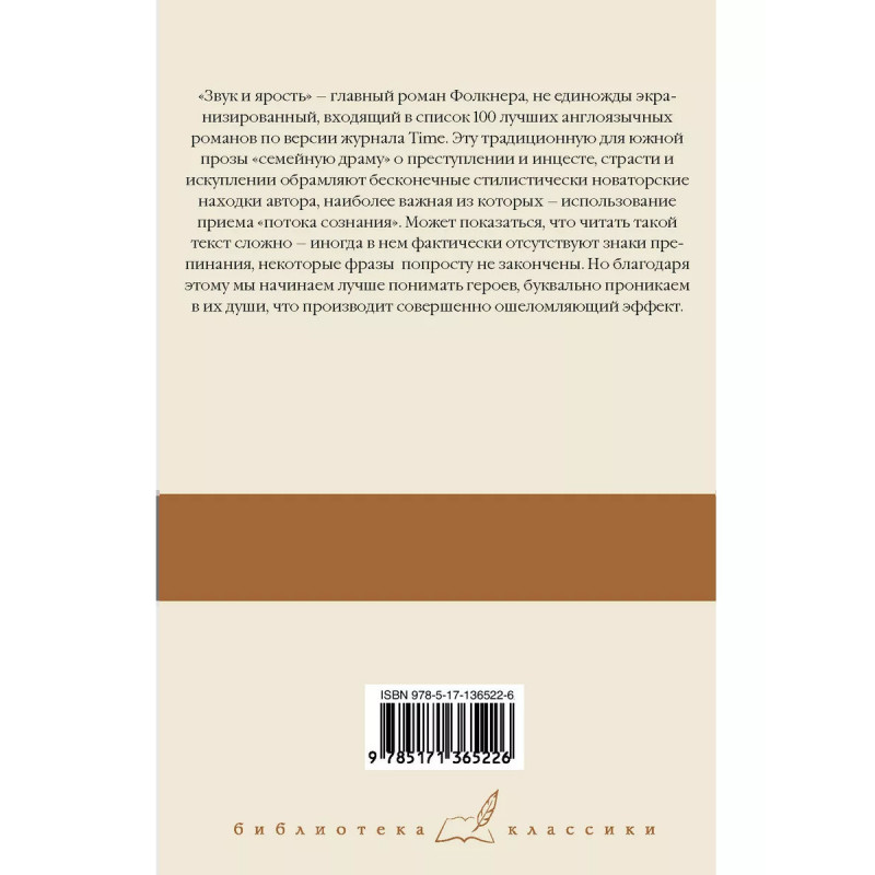 "Звук и ярость" главный роман Фолкнера, не единожды экранизированный, входящий в список 100 лучших англоязычных романов по версии журнала Time. Эту традиционную для южной прозы "семейную драму" о преступлении и инцесте, страсти и искуплении обрамляют бесконечные стилистически новаторские находки автора, наиболее важная из которых использование приема "потока сознания". Может показаться, что читать такой текст сложно иногда в нем фактически отсутствуют знаки препинания, некоторые попросту фразы не закончены. Но благодаря этому мы начинаем лучше понимать героев, буквально проникаем в их души, что производит совершенно ошеломляющий эффект.