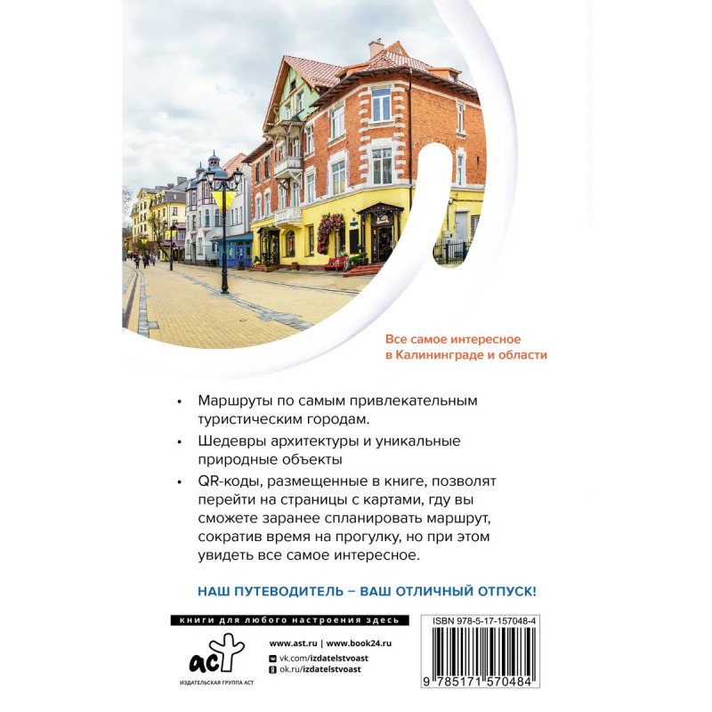 Путеводитель рассчитан на самостоятельных путешественников, готовых познакомиться с уникальным регионом, богатым историей, культурой, природными объектами. В путеводителе вы найдете описания маршрутов самых интересных прогулок по городам Калининградской области. Фотографии дадут вам представление о местности и достопримечательностях. Предложенные в начале глав книги QR-коды с переходом на карты с маршрутами, значительно облегчат ориентирование. С нашим путеводителем за меньшее количество времени вы увидите больше в Калининграде, Светлогорске, Зеленоградске, Балтийске, Янтарном, Гвардейске и на Куршской косе. Старые форты и современные музеи, уникальные природные достопримечательности и сувениры обо всем этом в книге небольшого формата в мягкой обложке, что позволит вам взять издание с собой в путешествие.