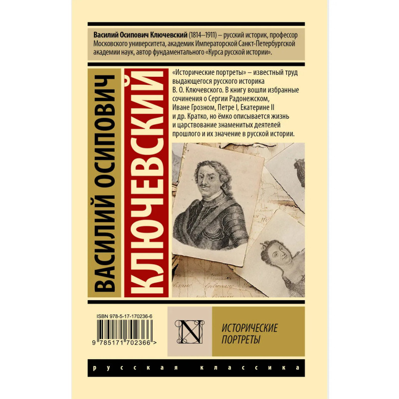 — «Исторические портреты» — известный труд Василия Осиповича Ключевского, выдающегося русского историка второй половины XIX века. — «Исторические портреты» основаны на «Курсе русской истории», над созданием которого Ключевский работал более тридцати лет и который принес ему всемирную известность. — В книгу вошли краткие, но яркие и емкие описания князей и царей, священнослужителей и святых, дипломатов и полководцев — знаменитых деятелей прошлого, оказавших огромное влияние на историю страны. — На страницах этой книги вы найдете описания Ивана Грозного и Сергия Радонежского, Петра I и Екатерины II… — Издание в серии «Эксклюзив: Русская классика» — в удобном карманном формате и узнаваемом оформлении.
