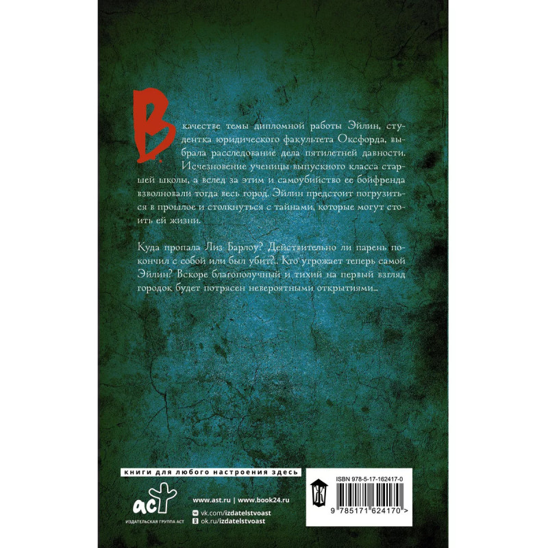 В качестве темы дипломной работы Эйлин, студентка юридического факультета Оксфорда, выбрала расследование дела пятилетней давности. Исчезновение ученицы выпускного класса старшей школы, а вслед за этим и самоубийство ее бойфренда взволновали тогда весь город. Эйлин предстоит погрузиться в прошлое и столкнуться с тайнами, которые могут стоить ей жизни. Куда пропала Лиз Барлоу? Действительно ли парень покончил с собой, или был убит?.. Кто угрожает теперь самой Эйлин? Вскоре благополучный и тихий на первый взгляд городок будет потрясен невероятными открытиями
