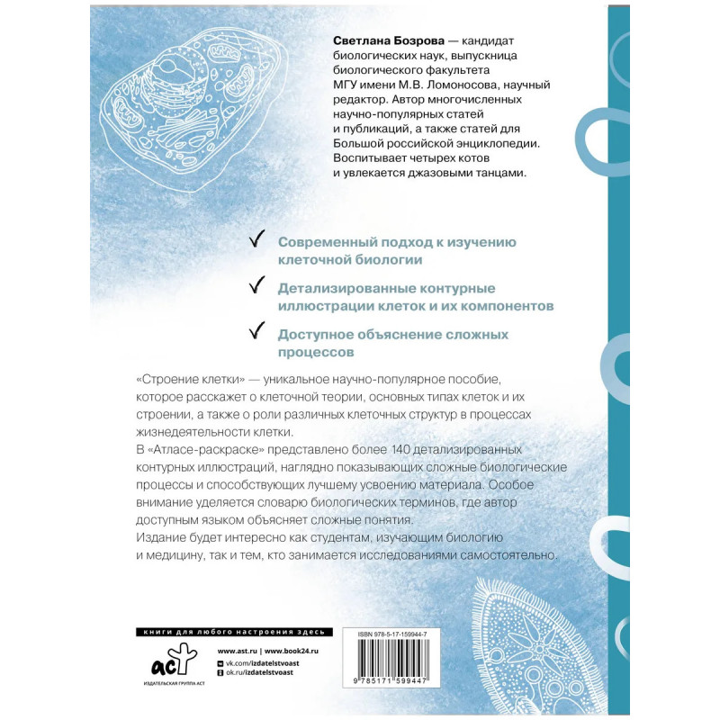 Светлана Бозрова — кандидат биологических наук, выпускница биологического факультета МГУ имени М.В. Ломоносова, научный редактор. Автор многочисленных научно-популярных статей и публикаций, а также статей для Большой российской энциклопедии. Воспитывает четырех котов и увлекается джазовыми танцами. • Современный подход к изучению клеточной биологии • Детализированные контурные иллюстрации клеток и их компонентов • Доступное объяснение сложных процессов "Строение клетки" — уникальное научно-популярное пособие, которое расскажет о клеточной теории, основных типах клеток и их строении, а также о роли различных клеточных структур в процессах жизнедеятельности клетки. В "Атласе-раскраске" представлено более 140 детализированных контурных иллюстраций, наглядно показывающих сложные биологические процессы и способствующих лучшему усвоению материала. Особое внимание уделяется словарю биологических терминов, где автор доступным языком объясняет сложные понятия.