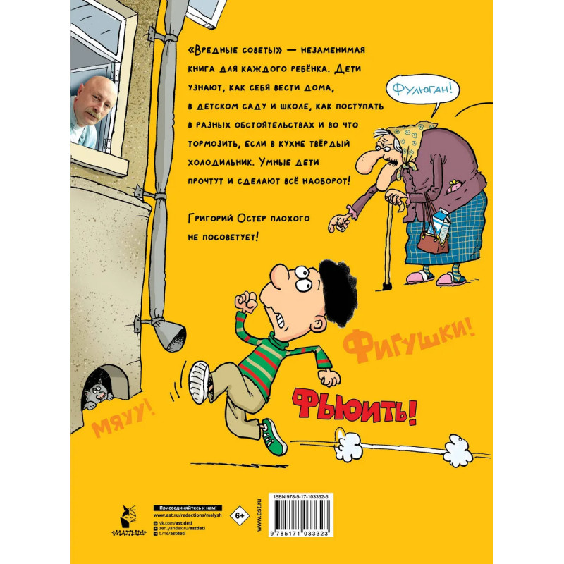 «Вредные советы» − незаменимая книга для каждого ребёнка. Дети узнают, как себя вести дома, в детском саду и школе, как поступать в разных обстоятельствах и во что тормозить, если в кухне твёрдый холодильник. Умные дети прочтут и сделают всё наоборот! Григорий Остер плохого не посоветует!
