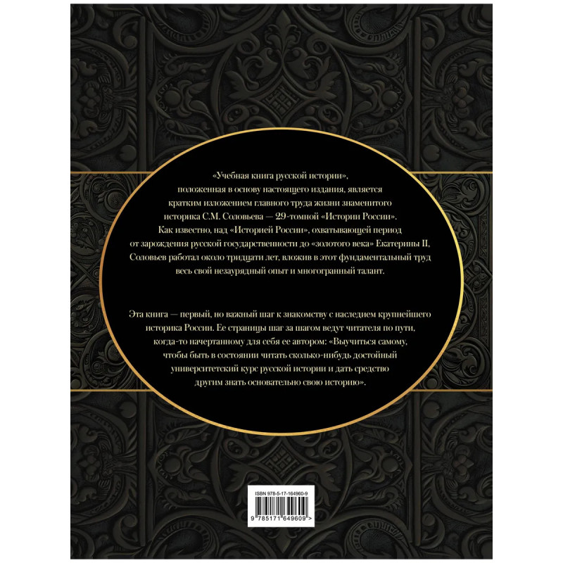 "Учебная книга русской истории", положенная в основу настоящего издания, является кратким изложением главного труда жизни знаменитого историка С.М. Соловьева 29-томной "Истории России". Как известно, над "Историей России", охватывающей период от зарождения русской государственности до "золотого века" Екатерины II, Соловьев работал около тридцати лет, вложив в этот фундаментальный труд весь свой незаурядный опыт и многогранный талант. Эта книга первый, но важный шаг к знакомству с наследием крупнейшего историка России. Ее страницы шаг за шагом ведут читателя по пути, когда-то начертанному для себя ее автором: "Выучиться самому, чтобы быть в состоянии читать сколько-нибудь достойный университетский курс русской истории и дать средство другим знать основательно свою историю". Данное издание богато проиллюстрировано, что дополняет и усиливает впечатление от чтения книги.
