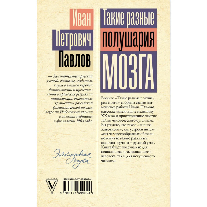 Иван Петрович Павлов замечательный русский ученый, физиолог, создатель науки о высшей нервной деятельности и представлений о процессах регуляции пищеварения, основатель крупнейшей российской физиологической школы, лауреат Нобелевской премии в области медицины и физиологии 1904 года. В книге "Такие разные полушария мозга" собраны самые знаменитые его работы, навсегда изменившие медицину ХХ века и приоткрывшие многие тайны человеческого организма. Вы узнаете, что такое "гипноз животного", как устроен интеллект человекообразных обезьян, почему так важно различать понятия "ум" и "русский ум". Книга будет полезна как для непосвященного незнающего человека, так и для искушенного читателя.