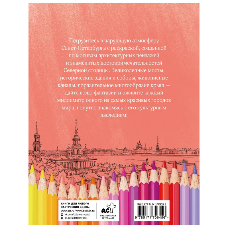 Погрузитесь в чарующую атмосферу Санкт-Петербурга с раскраской, созданной по мотивам архитектурных пейзажей и знаменитых достопримечательностей северной столицы. Великолепные мосты, исторические здания и соборы, живописные каналы, поразительное многообразие крыш - дайте волю фантазии и оживите каждый миллиметр одного из самых красивых городов мира, попутно знакомясь с его культурным наследием!