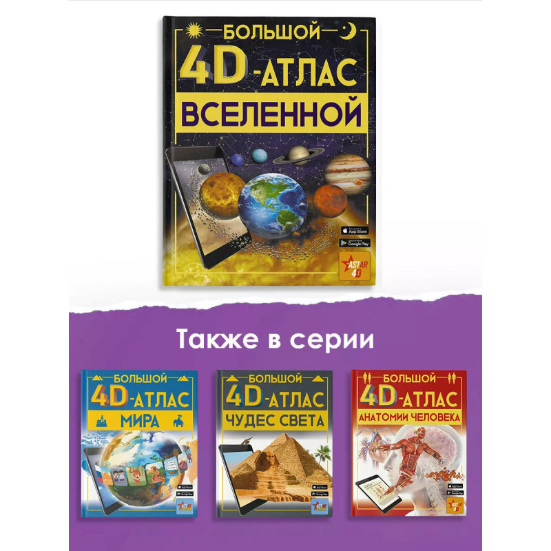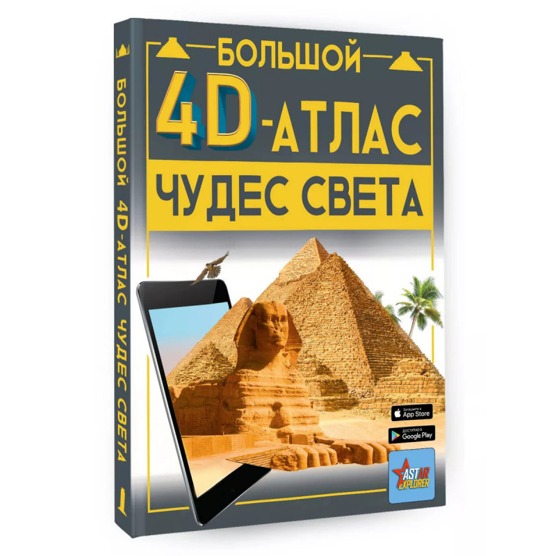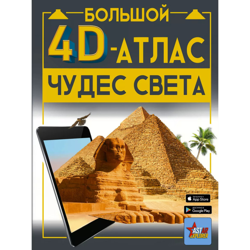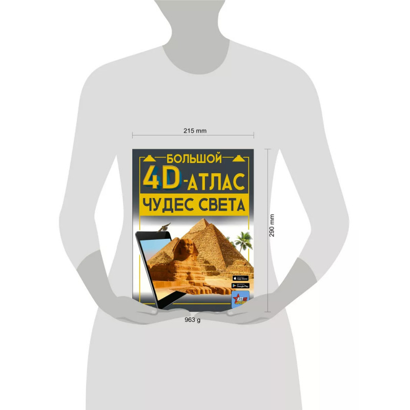 Большой 4D-атлас чудес света. Этот большой великолепно иллюстрированный 4D-атлас приоткроет перед юными читателями тайны необыкновенных сооружений древних цивилизаций и архитектурных шедевров современности, которыеобъединены общим названием "чудеса света". В древности их было семь, однако с течением времени таких удивительных творений, созданных природой и человеческим гением, насчитывается ужегораздо больше. К признанным чудесам света добавились даже некоторые обитатели растительного иживотного мира, обладающие необычным внешним видом или какими-то невероятными способностями. Обо всех этих замечательных объектах вы сможете узнать, листая уникальную книгу нового поколения, в которой важные сведения и любопытные факты приведены в сопровождении огромного количества зрелищных иллюстраций. А новейшие 4D-технологии совершенно изменят восприятие прочитанного, позволяя обозревать чудеса света в интерактивном режиме. Чтобы знаменитые памятники природы, истории и культуры "ожили" и "заговорили", необходимо будет лишь скачать бесплатное приложение