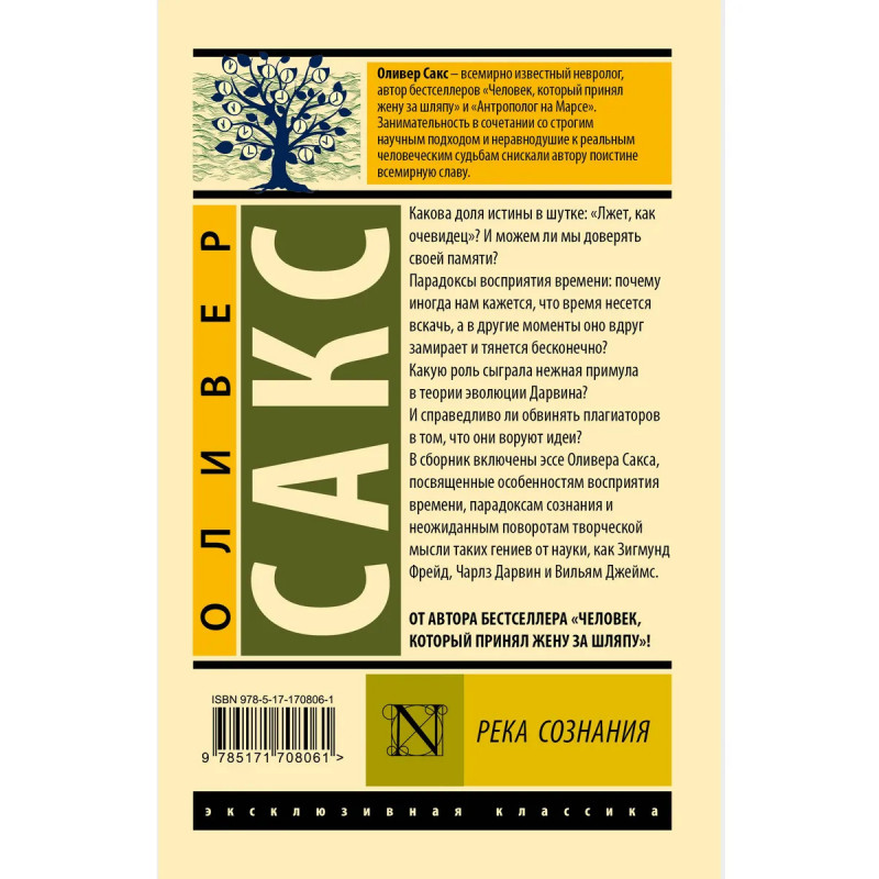 — От автора бестселлеров «Человек, который принял жену за шляпу» и «Антрополог на Марсе». — Оливер Сакс — всемирно известный британский невролог, нейропсихолог и популяризатор науки. — В данный сборник включены эссе Оливера Сакса, посвященные особенностям восприятия времени, парадоксам сознания и неожиданным поворотам творческой мысли таких гениев от науки, как Зигмунд Фрейд, Чарлз Дарвин и Вильям Джеймс. — Издание в серии «Эксклюзивная классика» — в удобном карманном формате и узнаваемом оформлении.