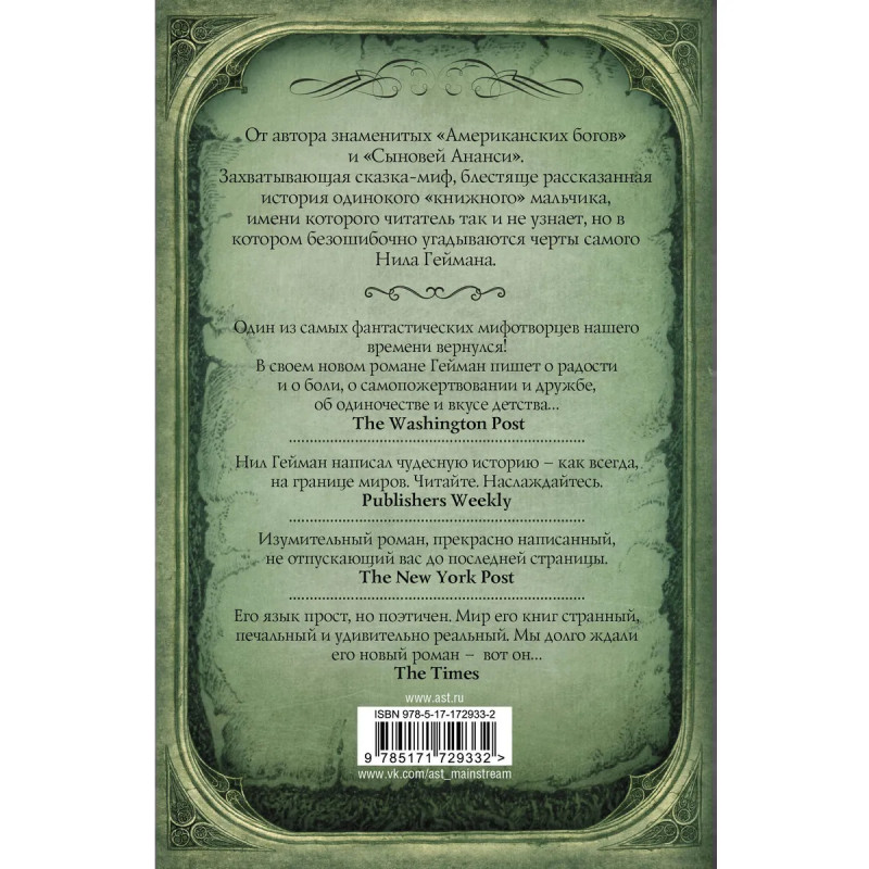 Захватывающая сказка-миф от знаменитого автора "Сыновей Ананси" и "Американских богов". Блестяще рассказанная история одинокого "книжного" мальчика, имени которого читатель так и не узнает, но в котором безошибочно угадываются черты самого Нила Геймана. Прогулка по фермам Сассекса приводит героя к дому древних богов, играющих в людей, и с этой минуты ткань привычного мира рвется и выворачивается наизнанку, а в прореху пролезают существа иномирья — такие странные и страшные, что их невозможно представить.
