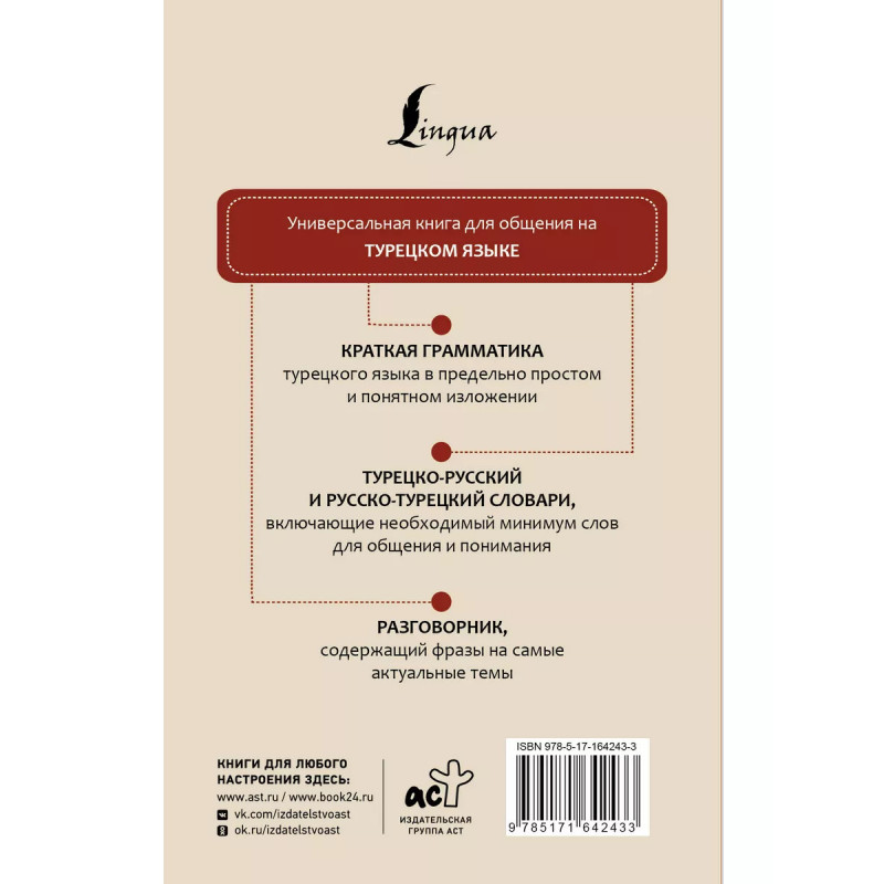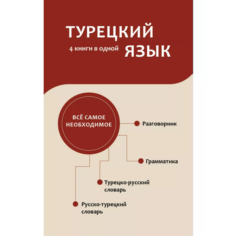 В издании "Турецкий язык. 4 книги в одной: разговорник, турецко-русский словарь, русско-турецкий словарь, грамматика" собраны самые важные материалы для изучения иностранного языка: базовый объем грамматики для изучения, разговорник, с помощью которого можно легко научиться применять грамматические правила на практике и улучшить разговорную речь, турецко-русский и русско-турецкий словари, содержащие самые употребительные слова и словосочетания. Формат книги оптимально подходит для того, чтобы брать ее с собой в поездки или на занятия в качестве справочного издания. "Турецкий язык. 4 книги в одной: разговорник, турецко-русский словарь, русско-турецкий словарь, грамматика" подойдет для начинающих изучать язык, а также для уровня владения языком А1, А2.