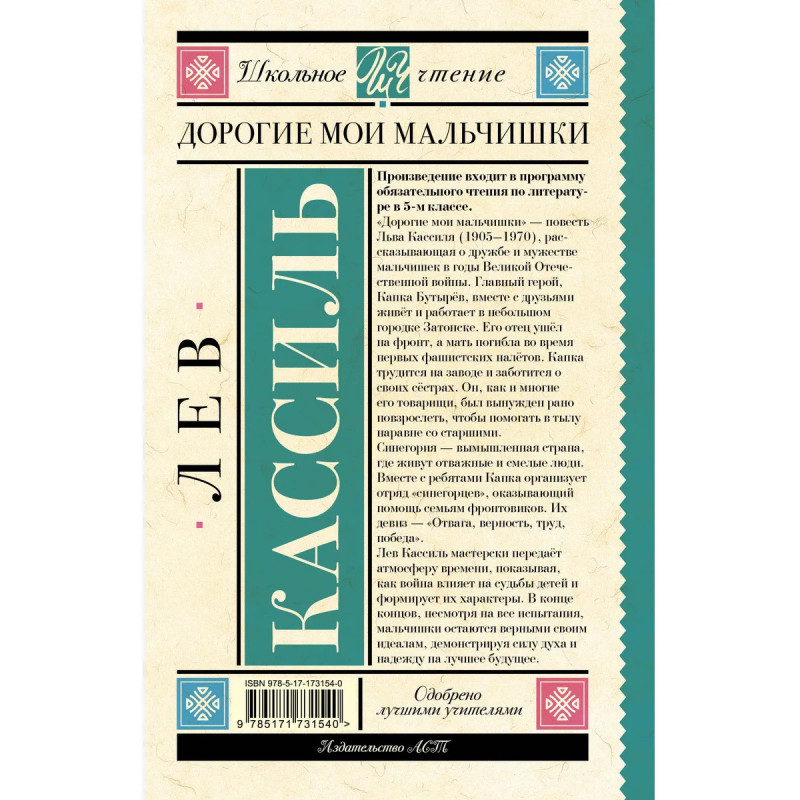Произведение входит в программу обязательного чтения по литературе в 5-м классе. "Дорогие мои мальчишки" — повесть Льва Кассиля (1905–1970), рассказывающая о дружбе и мужестве мальчишек в годы Великой Отечественной войны. Главный герой, Капка Бутырёв, вместе с друзьями живёт и работает в небольшом городке Затонске. Его отец ушёл на фронт, а мать погибла во время первых фашистских налётов. Капка трудится на заводе и заботится о своих сёстрах. Он, как и многие его товарищи, был вынужден рано повзрослеть, чтобы помогать в тылу наравне со старшими. Синегория — вымышленная страна, где живут отважные и смелые люди. Вместе с ребятами Капка организует отряд "синегорцев", оказывающий помощь семьям фронтовиков. Их девиз — "Отвага, верность, труд, победа". Лев Кассиль мастерски передаёт атмосферу времени, показывая, как война влияет на судьбы детей и формирует их характеры. В конце концов, несмотря на все испытания, мальчишки остаются верными своим идеалам, демонстрируя силу духа и надежду на лучшее будущее.
