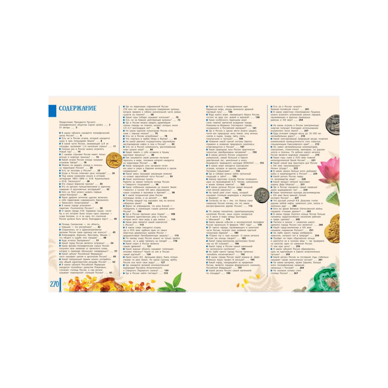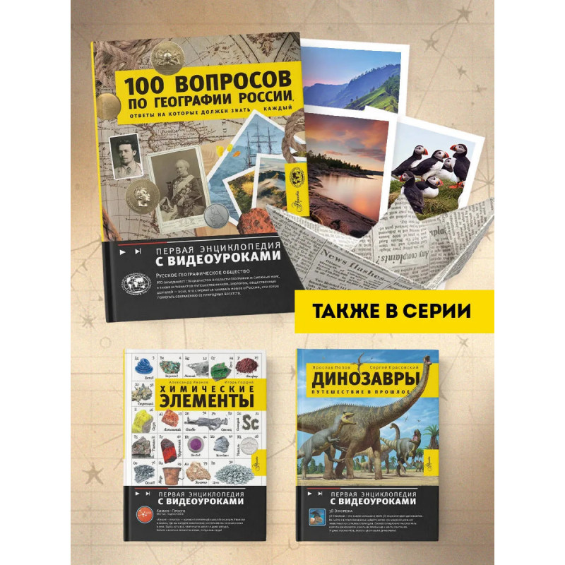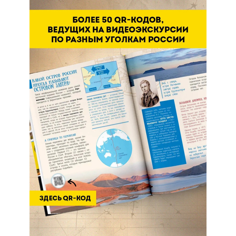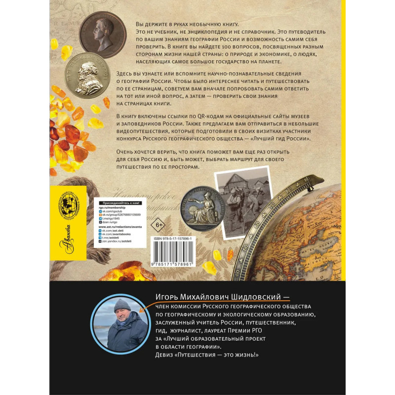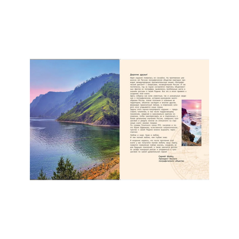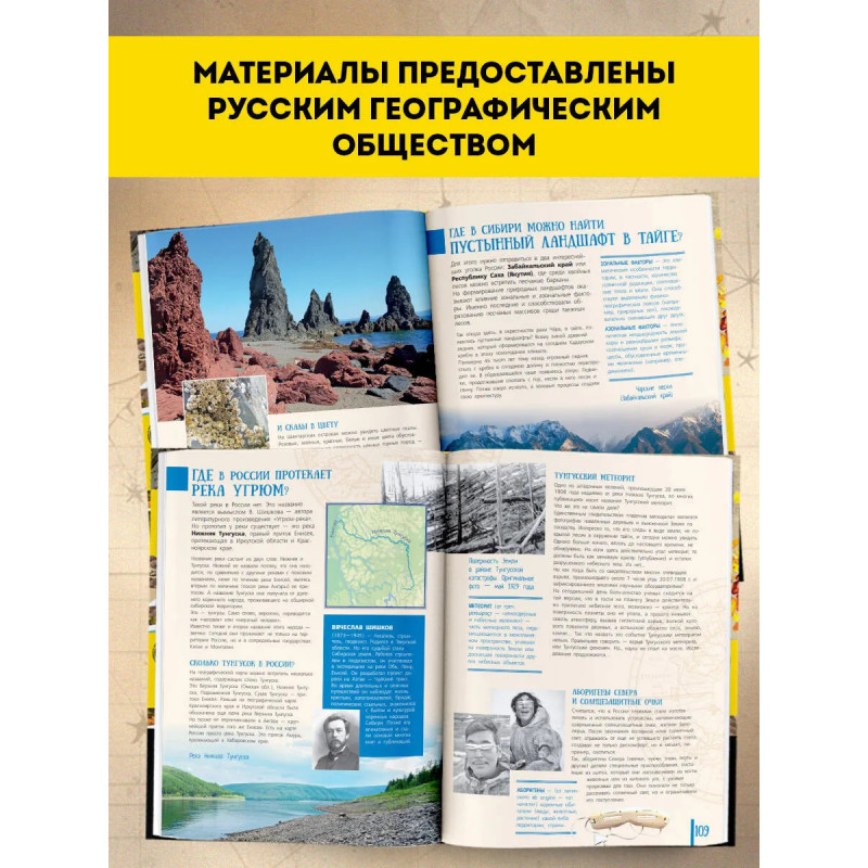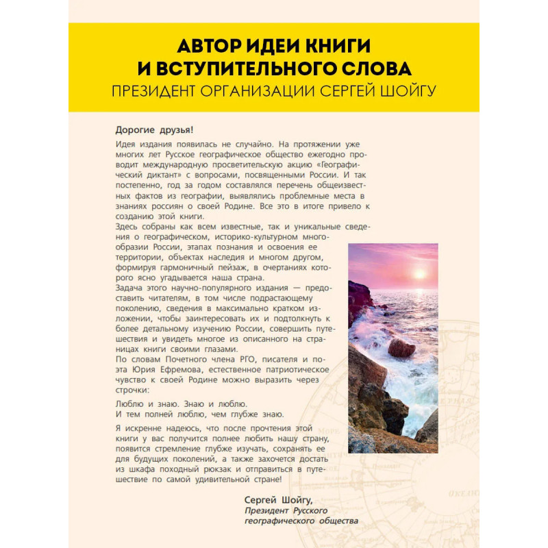 Русское географическое общество ежегодно проводит просветительскую акцию "Географи- ческий диктант", задавая людям вопросы, посвященные нашей общей родине. Так появился перечень важных тем о России и выявились проблемные места в знаниях. Собственно, это и привело к созданию необычного издания, которое вы держите в руках. В ней собраны как уникальные сведения о географическом, историко-культурном многообразии нашей страны, эта- пах освоения ее территории, объектах наследия и многом другом, так и общеизвестные факты о России. Задача этого необычного научно-популярного издания состоит в том, чтобы предоста- вить читателю сведения в максимально кратком изложении, заинтересовать его и подтолкнуть к. более детальному изучению нашей страны — огромной в территориальном, природном, этно- графическом и культурном отношении. Узнавая свою страну, невозможно не полюбить ее! От- правляемся в путешествие по России с Русским географическим обществом.