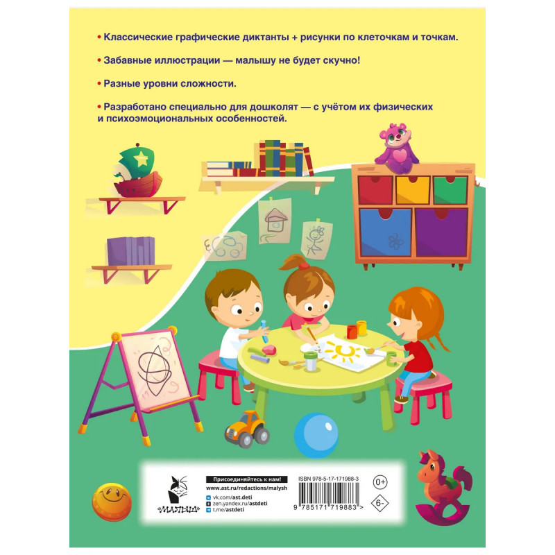 Весело шагаем по клеточкам и получаем суперполезные навыки для будущего успешного обучения в школе! Тренажёр «Графические диктанты» разработан специально для детского сада — с учётом физических и психоэмоциональных особенностей дошколят. На 64 страницах формата А4 вы найдёте задания на любой вкус и разных уровней сложности. Малыш прекрасно проведёт время в компании забавных героев и заодно улучшит навыки письма, потренирует точность движений, разовьёт пространственное мышление и зрительную память, станет более внимательным и сосредоточенным. Уроки без скуки — то, что надо! Сделайте замечательный подарок вашему ребёнку!