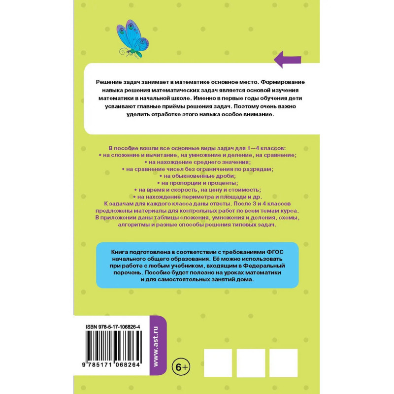 Решение задач занимает в математике основное место. Формирование навыка решения математических задач является одной из важных задач начальной школы. Именно в первые годы обучения дети усваивают главные приемы решения задач. Поэтому очень важно уделить отработке этого навыка особое внимание. В пособие вошли все основные виды задач для 1-4 классов: - на сложение и вычитание, на умножение и деление, на сравнение; - на нахождение среднего значения; - на сравнение чисел без ограничения по разрядам; - на обыкновенные дроби; - на пропорции и проценты; - на время и скорость, на цену и стоимость; - на нахождение периметра и площади и др. К задачам для каждого класса даны ответы. После 3 и 4 классов предложены материалы для контрольных работ по всем темам курса. В приложении даны таблицы сложения, умножения и деления, схемы, алгоритмы и разные способы решения типовых задач. Книга подготовлена в соответствии с требованиями ФГОС начального образования.