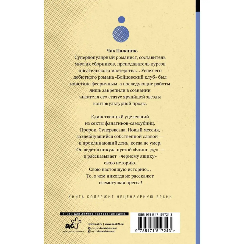 От автора бестселлера Бойцовский клуб. Совокупный тираж книг автора превышает 3 экземпляров. Исповедь, изложенная без прикрас, со всей грубостью и резкостью слов. Со всей мрачностью и некоторой банальностью жизни человека.