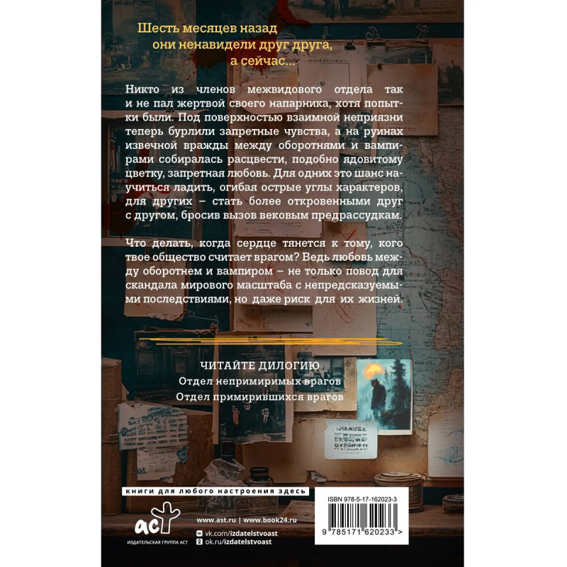 – Заключительная часть дилогии, продолжение романа «Отдел непримиримых врагов». – Захватывающее городское фэнтези о детективном отделе, состоящем из вампиров и оборотней, которым приходится уживаться и работать вместе. – Романтические линии о запретных межвидовых отношениях. – В духе романов «Легкий заказ» Андрея Васильева, «Медиаторы» Дарьи Буданцевой и «Ковен заблудших ведьм» Анастасии Гор.
