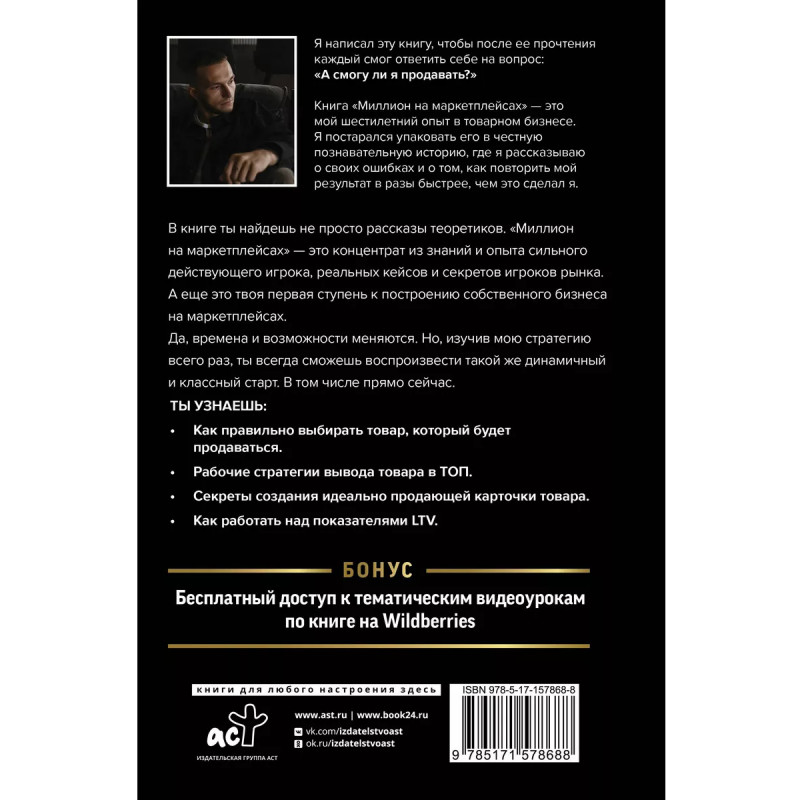 Миллион на маркетплейсах. Продано!. Я написал эту книгу, чтобы после ее прочтения каждый смог ответить себе на вопрос: "А смогу ли я продавать?" Книга "Миллион на маркетплейсах" - это мой шестилетний опыт в товарном бизнесе. Я постарался упаковать его в честную познавательную историю, где я рассказываю о своих ошибках и о том, как повторить мой результат в разы быстрее, чем это сделал я. В книге ты найдешь не просто рассказы теоретиков. "Миллион на маркетплейсах" - это концентрат из знаний и опыта сильного действующего игрока, реальных кейсов и секретов игроков рынка. А еще это твоя первая ступень к построению собственного бизнеса на маркетплейсах. Да, времена и возможности меняются. Но, изучив мою стратегию всего раз, ты всегда сможешь воспроизвести такой же динамичный и классный старт. В том числе прямо сейчас. ТЫ УЗНАЕШЬ: " Как правильно выбирать товар, который будет продаваться. " Рабочие стратегии вывода товара в ТОП. " Секреты создания идеально продающе й карточки товара. " Как работать над показателями LTV.
