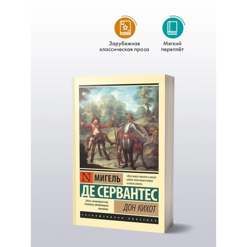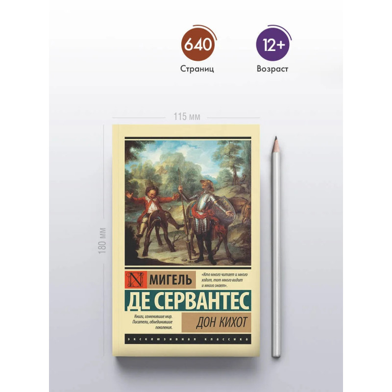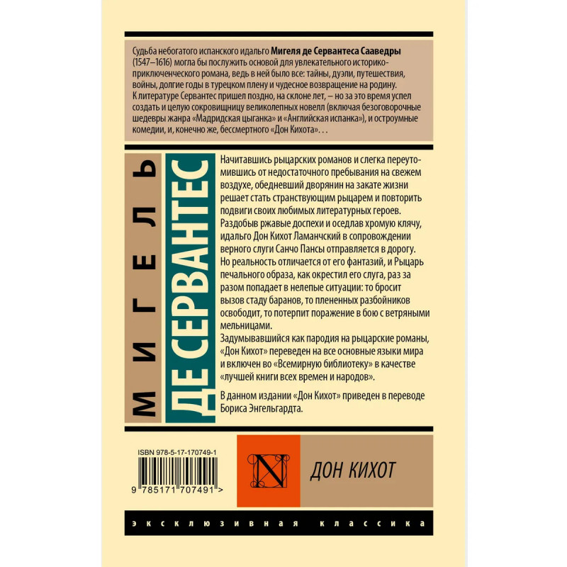 — «Хитроумный идальго Дон Кихот Ламанчский» — одно из самых популярных произведений в истории мировой литературы. Задуманная как пародия на рыцарские романы книга переведена на все мировые языки, многократно экранизирована и адаптирована для театральных сцен. — «Лучшая книга всех времен и народов» по версии «Всемирной библиотеки». — В данном издании роман приведен в классическом переводе советского филолога и литературоведа Бориса Энгельгардта. — Издание в серии «Эксклюзивная классика» — в удобном карманном формате и узнаваемом оформлении.