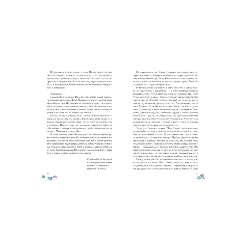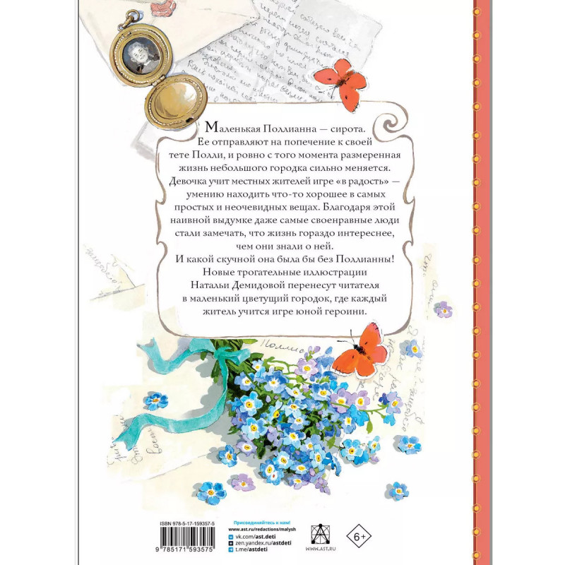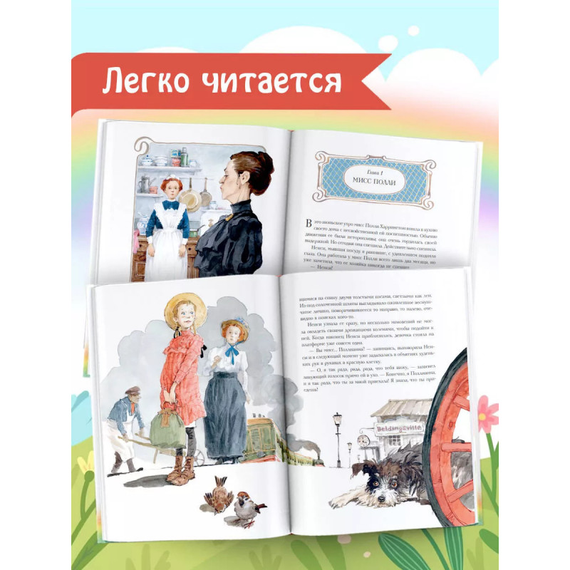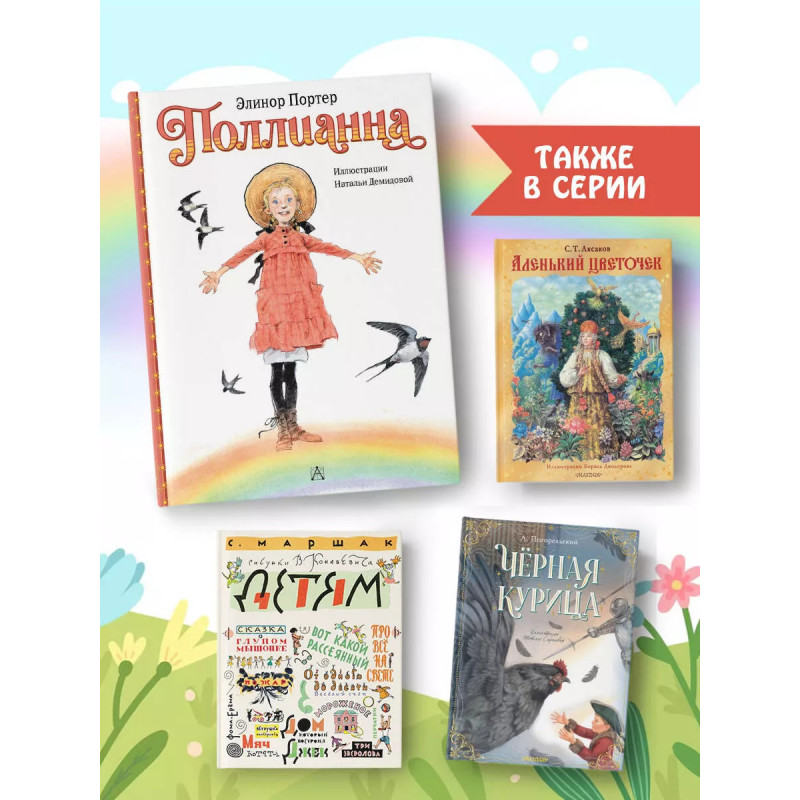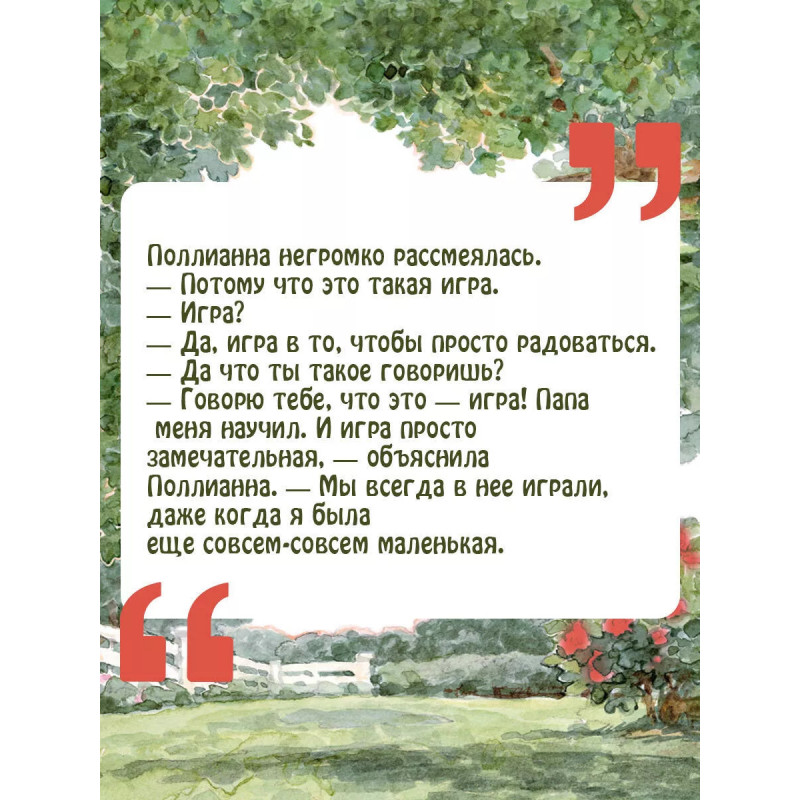 Маленькая Поллианна сирота. Ее отправляют на попечение к своей тете Полли, и ровно с того момента размеренная жизнь небольшого городка сильно меняется. Девочка учит местных жителей игре в радость умении находить что-то хорошее в самых простых и неочевидных вещах. Благодаря этой наивной выдумке даже самые своенравные люди стали замечать, что жизнь гораздо интереснее, чем они знали о ней. И какой скучной она была бы без Поллианны! Новые трогательные иллюстрации Натальи Демидовой перенесут читателя в маленький цветущий городок, где каждый житель учится игре юной героини.