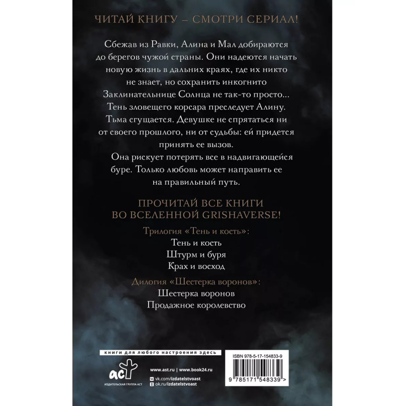 Переиздание легендарного цикла Тень и кость в кинообложке! Вторая часть фэнтезийной саги о заклинательнице Солнца. При создании новой вселенной писательница вдохновлялась Российской империей XIX века и изучала русский фольклор и историю. Ли Баргудо удалось создать детально проработанный мир со своими легендами, убеждениями, необычными существами и, разумеется, правилами. Все нюансы раскрываются постепенно по мере повествования. С каждой новой строчкой все сильнее хочется узнать, что еще приготовила автор.