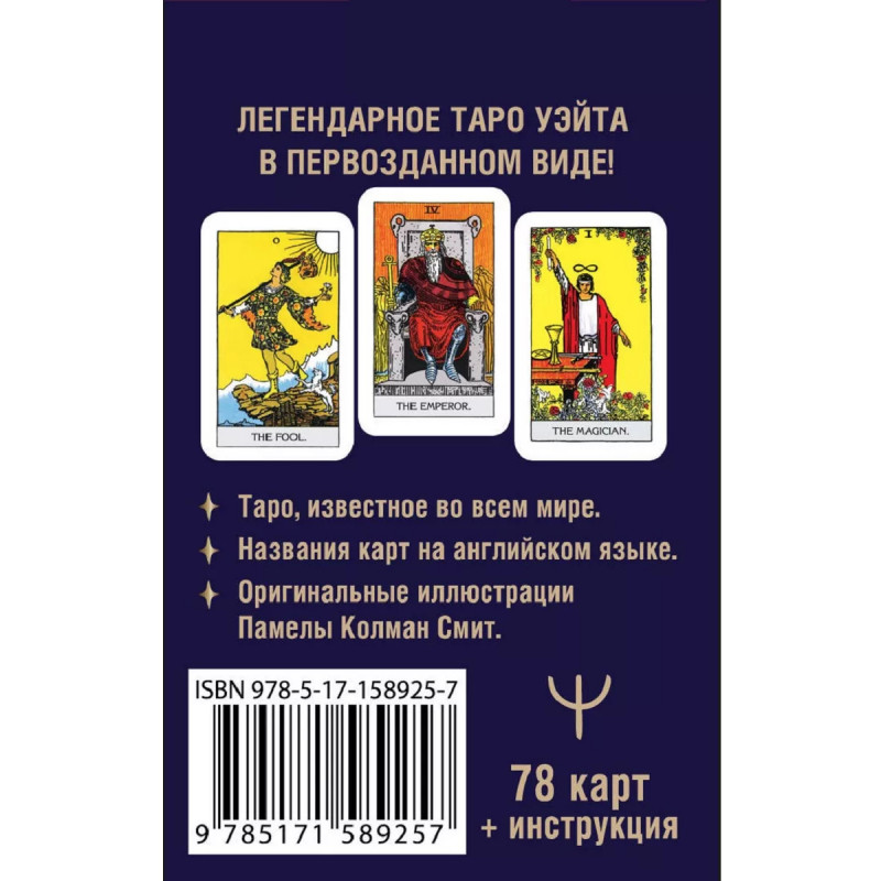 Мини Таро Уэйта 1910 года. Без искажений. Классическое Таро Уэйта известно во всем мире. Перед вами точная копия первой колоды, выпущенной более ста лет назад. Эта колода уже доказала, что является универсальным инструментом для предсказания будущего, признана тарологами и считается обязательной для всех, кто увлекается Таро. В этом издании названия карт даны на английском языке, как задумал их Артур Уэйт. Все иллюстрации авторства Памелы Смит и печатаются без искажений. Вместе с колодой вы найдете небольшое руководство с рекомендациями и раскладами от самого великого мастера Таро. Карты ответят на любые вопросы, дадут возможность заглянуть в будущее, разобраться в себе и своем окружении. Колода отлично подходит как для начинающих, так и для профессиональных тарологов. Эти карты Таро так же эффективны, как и карты стандартного размера, но имеют дополнительные плюсы. Их можно использовать во время гадания для увеличения точности предсказания. В комплект входят 78 оригинальных карт Таро Уэйта и краткое руководство для гадания. Удобный компактный формат