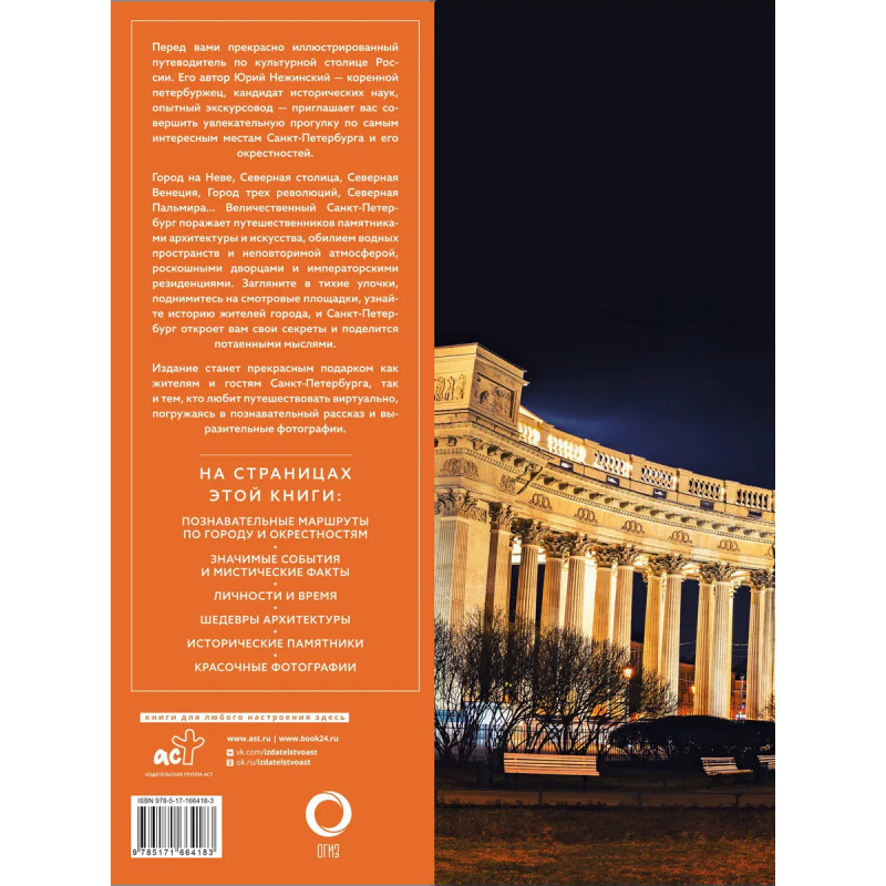 Перед вами прекрасно иллюстрированный путеводитель по культурной столице России. Его автор Юрий Нежинский – коренной петербуржец, кандидат исторических наук, опытный экскурсовод – приглашает вас совершить увлекательную прогулку по самым интересным местам Санкт-Петербурга и его окрестностей. Город на Неве, Северная столица, Северная Венеция, Город трех революций, Северная Пальмира... Величественный Санкт-Петербург поражает путешественников памятниками архитектуры и искусства, обилием водных пространств и неповторимой атмосферой, роскошными дворцами и императорскими резиденциями. Загляните в тихие улочки, поднимитесь на смотровые площадки, узнайте историю жителей города, и Санкт-Петербург откроет вам свои секреты и поделится потаенными мыслями. Издание станет прекрасным подарком как жителям и гостям Санкт-Петербурга, так и тем, кто любит путешествовать виртуально, погружаясь в познавательный рассказ и выразительные фотографии.