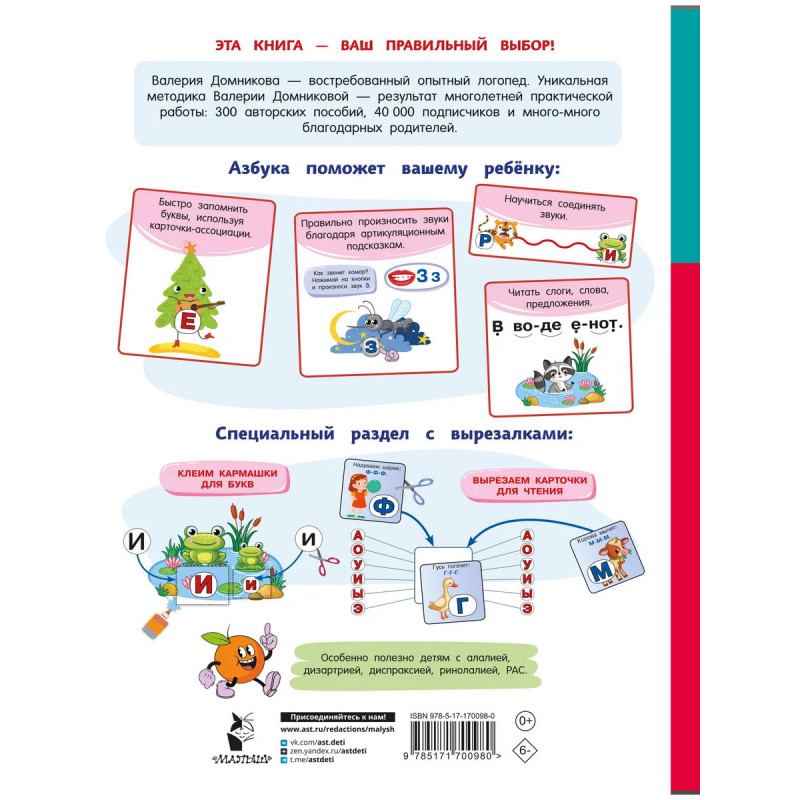 Представляем вашему вниманию новую серию книг от АСТ «Вам поможет логопед». Ребёнку пора учиться читать, но, к сожалению, у него есть проблемы с речью? Малыш пока с трудом произносит некоторые звуки или даже совсем отказывается называть сложный для него звук? Значит, вам нужна книга «Логопедическая азбука» опытного логопеда Валерии Домниковой, автора более 300 логопедических пособий. Эта книга стала результатом многолетней практической работы и основана на проверенной методике, благодаря которой тысячи детей обрели хорошую дикцию и грамотную речь. В книге вы найдёте простые и наглядные подсказки, с помощью которых сможете научить ребёнка правильно произносить конкретный звук. Каждой букве соответствует определённая сюжетная картинка-ассоциация — так малышу легче запомнить алфавит. Книга содержит специальный раздел с разрезными карточками и кармашками — с их помощью информация усваивается быстро и основательно. Игровая форма занятий и яркие красивые картинки обязательно заинтересуют вашего малыша.
