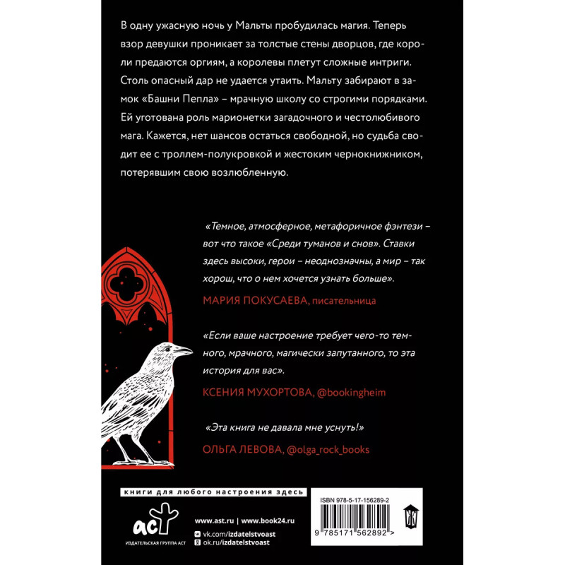 Среди туманов и снов. В одну ужасную ночь у Мальты пробудилась магия. Теперь взор девушки проникает за толстые стены дворцов, где короли предаются оргиям, а королевы плетут сложные интриги. Столь опасный дар не удается утаить. Мальту забирают в замок "Башни Пепла" - мрачную школу со строгими порядками. Ей уготована роль марионетки загадочного и честолюбивого мага. Кажется, нет шансов остаться свободной, но судьба сводит ее с троллем полукровкой и жестоким чернокнижником, потерявшим свою возлюбленную.