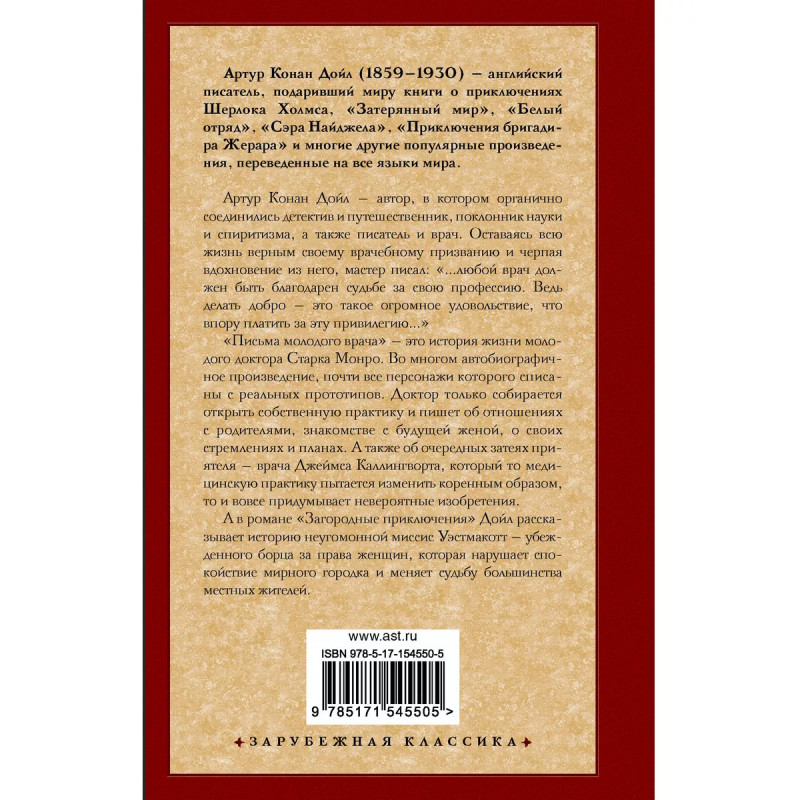 Письма молодого врача. Загородные приключения. Артур Конан Дойл - автор, в котором органично соединились детектив и путешественник, поклонник науки и спиритизма, а также писатель и врач. Оставаясь всю жизнь верным своему врачебному призванию и черпая вдохновение из него, мастер писал: " любой врач должен быть благодарен судьбе за свою профессию. Ведь делать добро - это такое огромное удовольствие, что впору платить за эту привилегию " "Письма молодого врача" - это история жизни молодого доктора Старка Монро. Во многом автобиографичное произведение, почти все персонажи которого списаны с реальных прототипов. Доктор только собирается открыть собственную практику и пишет об отношениях с родителями, знакомстве с будущей женой, о своих стремлениях и планах. А также об очередных затеях приятеля - врача Джеймса Каллингворта, который то медицинскую практику пытается изменить коренным образом, то и вовсе придумывает невероятные изобретения. А в романе "Загородные приключения" Дойл рассказывает историю неугомонной миссис Уэстмакотт - убежденного борца за права женщ