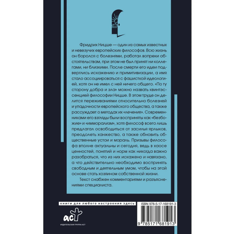 Фридрих Ницше один из самых известных и невезучих европейских философов. Всю жизнь он боролся с болезнями, работал вопреки обстоятельствам, при этом не был принят ни коллегами, ни близкими. После смерти его идеи подверглись искажению и примитивизации, а имя стало ассоциироваться с фашисткой идеологией, хотя он не имел с ней ничего общего. "По ту сторону добра и зла" можно назвать квинтэссенцией философии Ницше. В этом труде он делится переживаниями относительно болезней и упадочности европейского общества, а также рассуждает о методах их "лечения". Современниками его взгляды были восприняты как "безбожие" и "имморализм", хотя философ всего лишь предлагал освободиться от засилья ярлыков, преодолеть ханжество, а также обновить общественные устои и мораль.