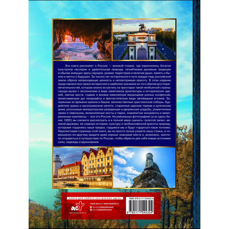 Большая энциклопедия. Золотая книга России. 1000 фотографий. Эта книга посвящена России - великой стране, где тесно переплелись многовековая история и неповторимая культура, огромная территория и удивительной красоты природа. В издании представлено все самое значимое и интересное из того колоссального обилия достопримечательностей, которое можно встретить от западных регионов до Дальнего Востока и от Крайнего Севера до южных границ Российской Федерации. На зрелищных фотографиях, а их число превышает 1, вы сможете рассмотреть и в полной мере оценить "золотой запас" этого многонационального государства: города-музеи с экспонатами в виде памятников архитектуры и исторических зданий, духовные святыни, годами и столетиями намоленные верующими разных конфессий, места боевой славы и народной памяти, а также захватывающие дух пейзажи и фантастические ландшафты. Вы получите шанс заново открыть для себя эту страну, и такое знакомство способно превзойти даже самые смелые ожидания, подарив незабываемые впечатления и вдохновив на новые путешествия по России.