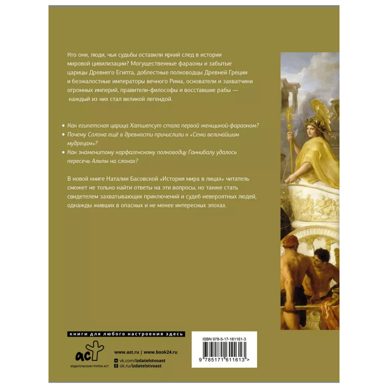 История мира в лицах. Кто они, те люди, чьи судьбы оставили яркий след в истории мировой цивилизации? Могущественные фараоны и забытые царицы Древнего Египта, доблестные полководцы Древней Греции и безжалостные императоры вечного Рима, основатели и захватчики огромных империй, правители-философы и восставшие рабы - каждый из них стал великой легендой. Как египетская царица Хатшепсут стала первой женщиной-фараоном? Почему Солона еще в древности причислили к "Cеми величайшим мудрецам"? Как знаменитому карфагенскому полководцу Ганнибалу удалось пересечь Альпы на слонах? В новой книге Наталии Басовской "История мира в лицах" читатель сможет не только найти ответы на эти вопросы, но также стать свидетелем захватывающих приключений и судеб невероятных людей, однажды живших в опасных и не менее интересных эпохах.